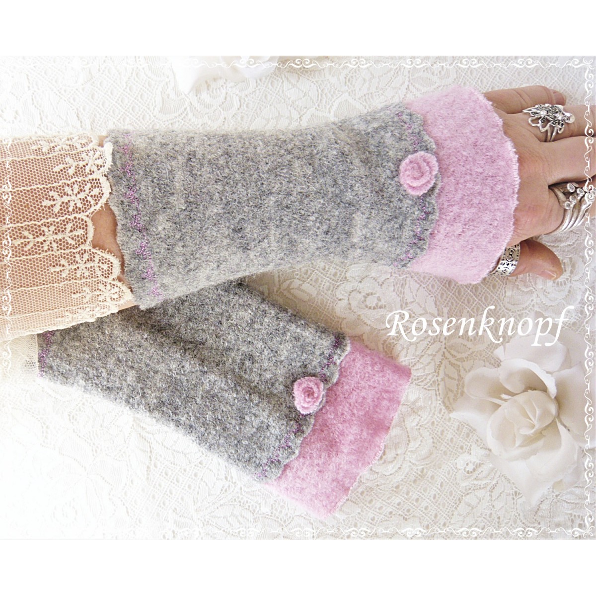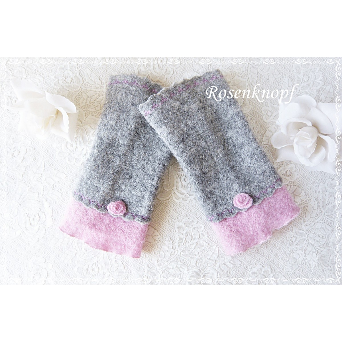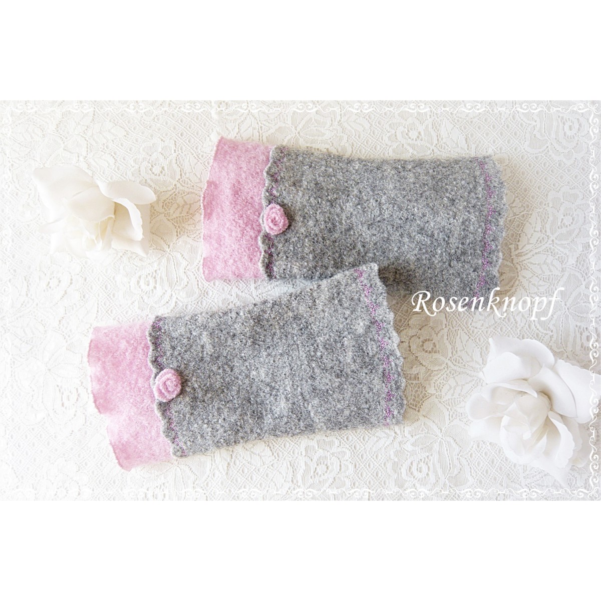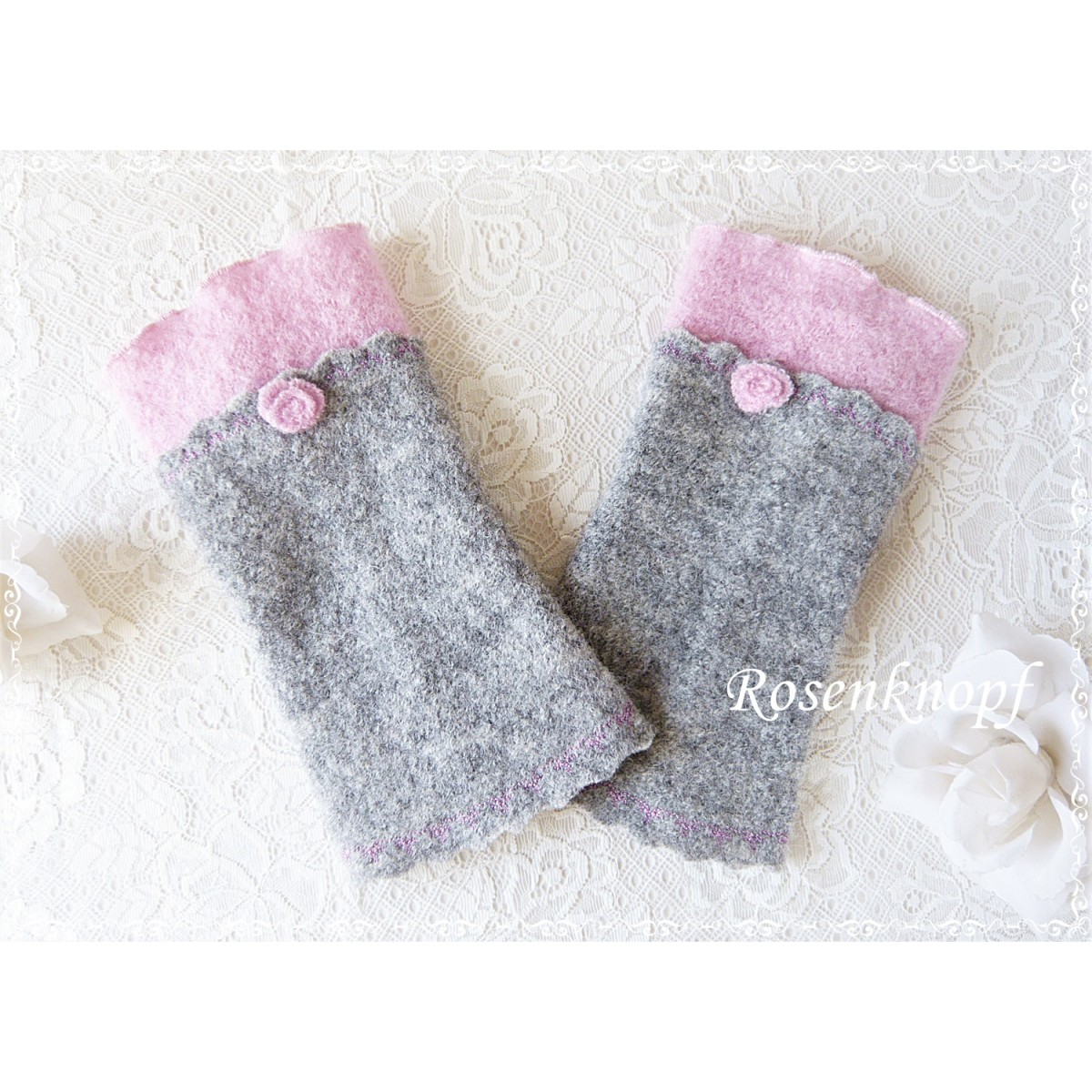 Zeitlose Walkstulpen aus hochwertigem Walk in Grau mit angesetztem Walk in zartem Rosa mit wellig versäumter Kante und einem Walkröschen.
