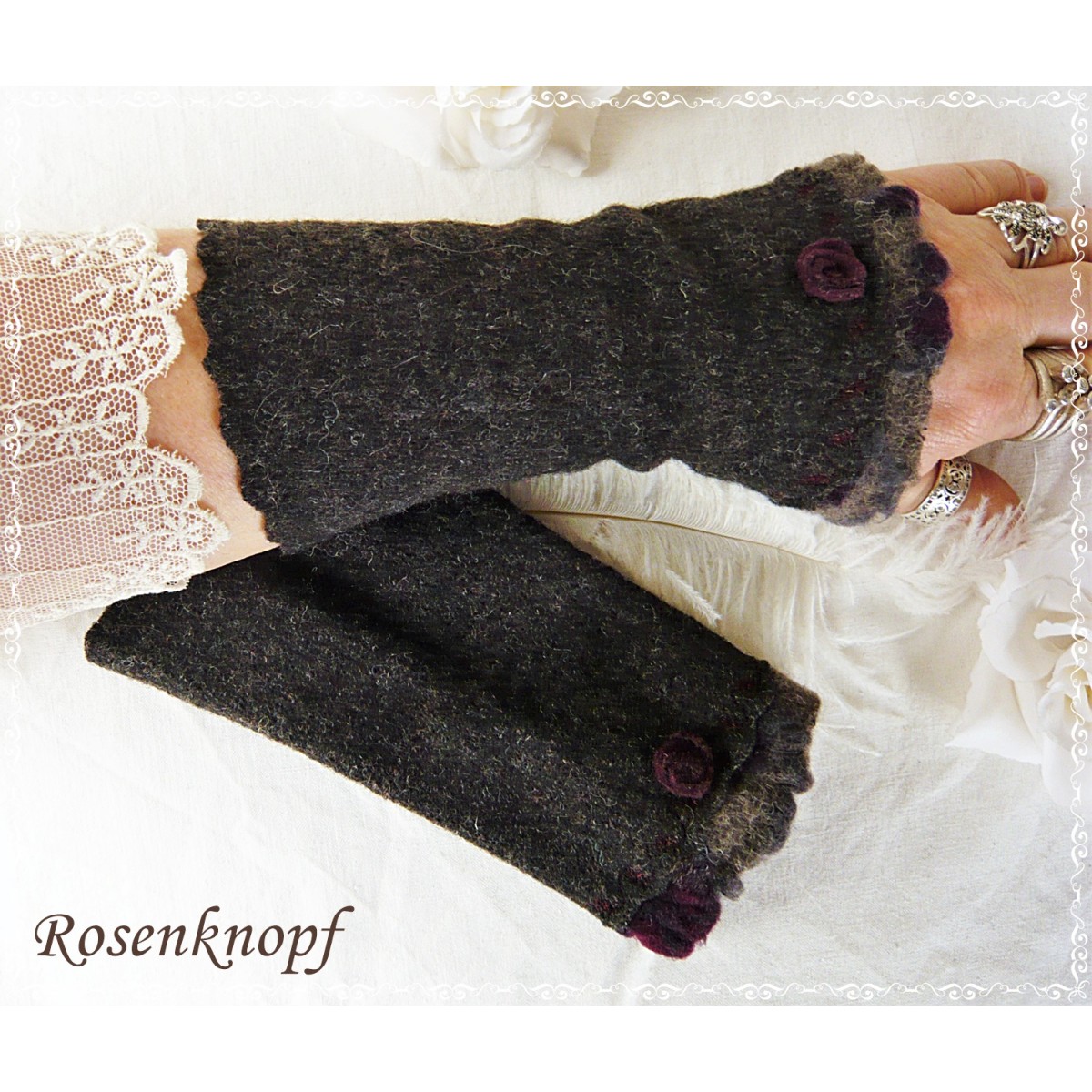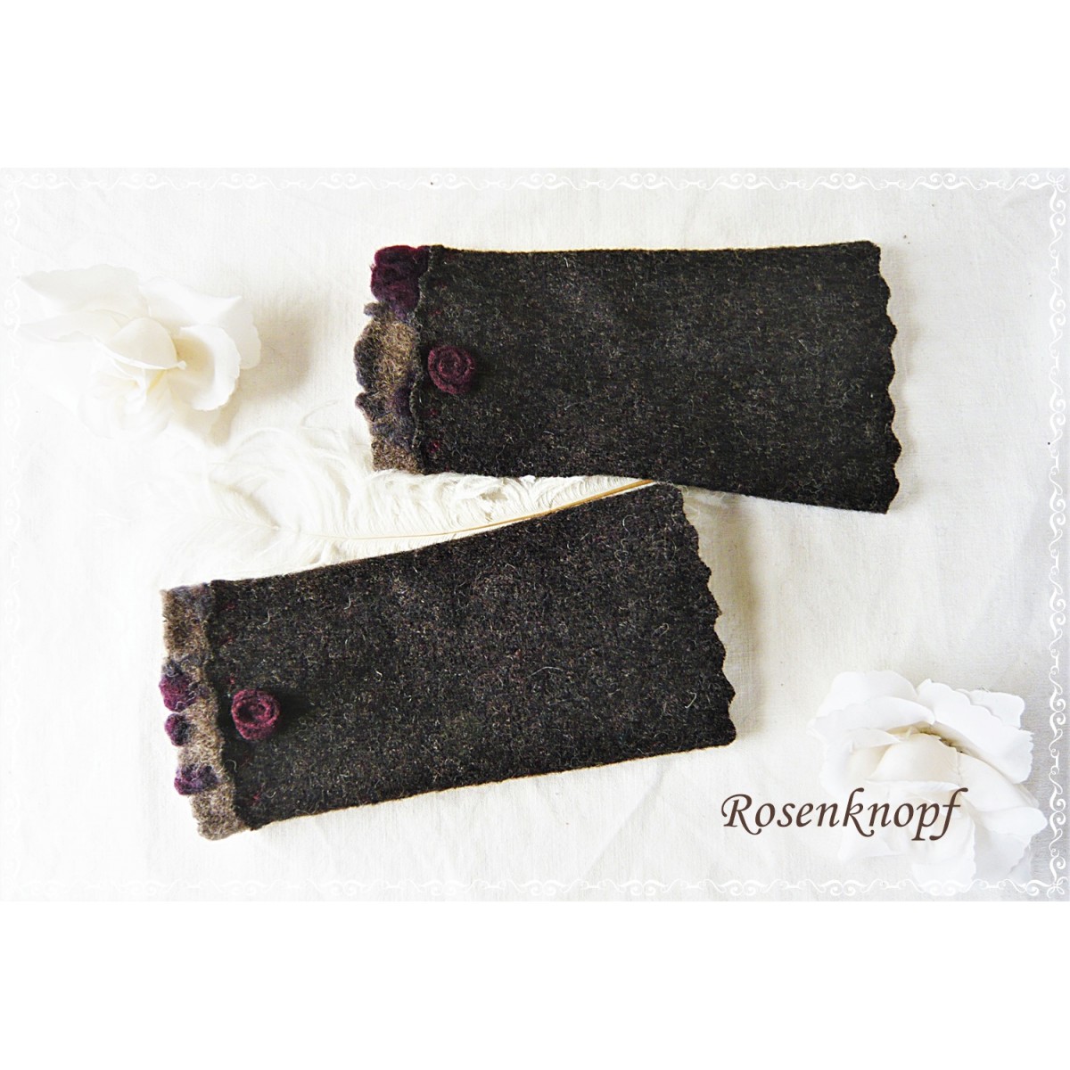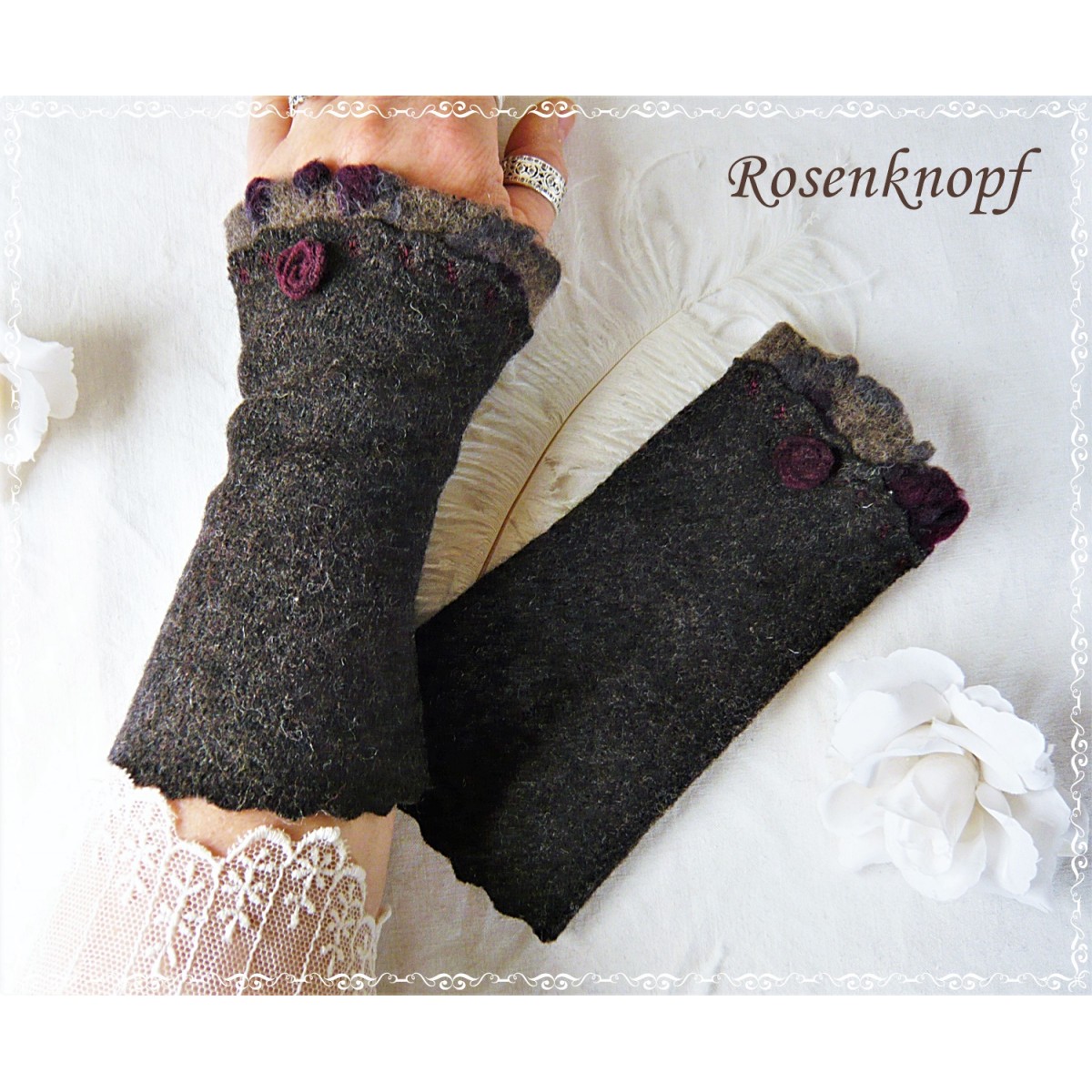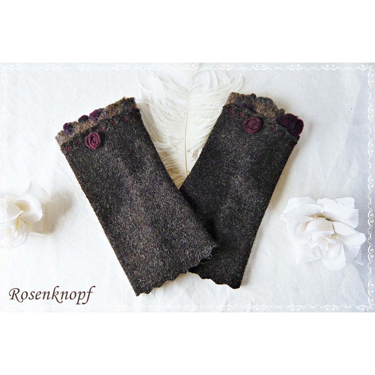 Die Damenstulpen haben vorne eine Walkwebkante in Schlamm mit Bordeaux und ein von mir gefertigtes Walkröschen.