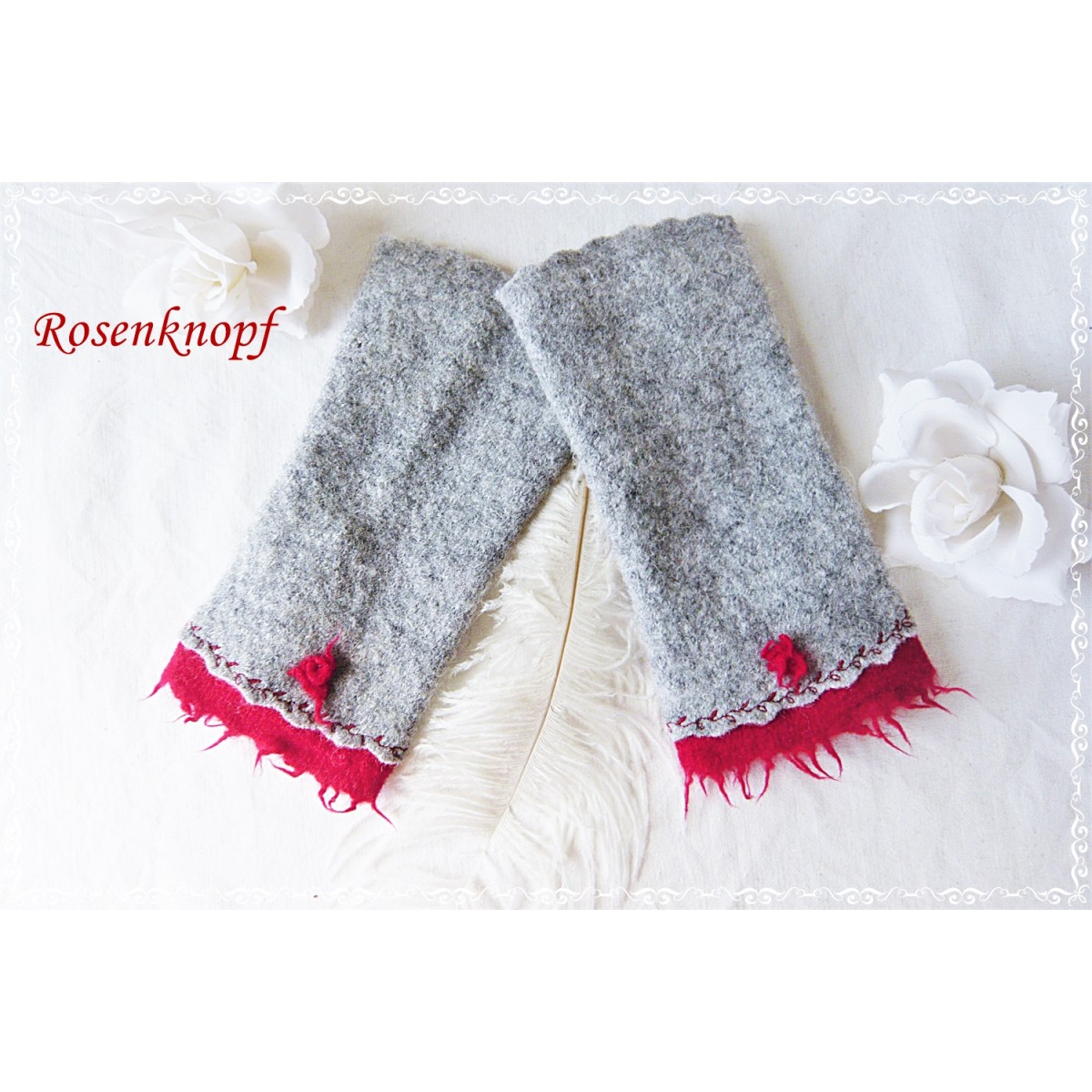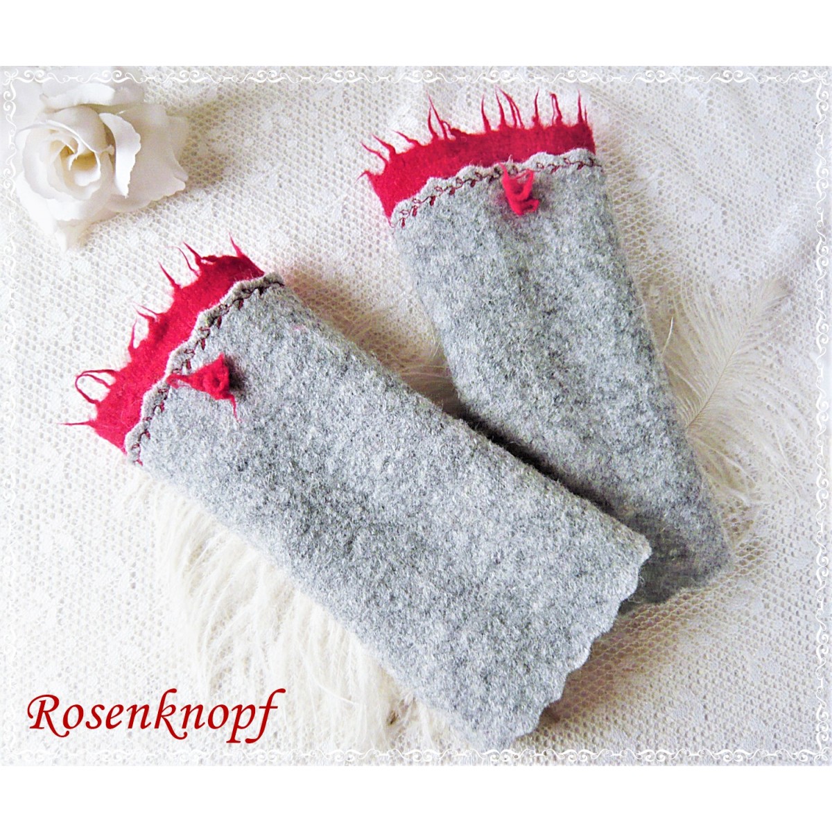 Zeitlose Walkstulpen aus hochwertigem Walk in Grau mit angesetzter fransiger Walk-Webkante in Rot und einem Walkröschen.