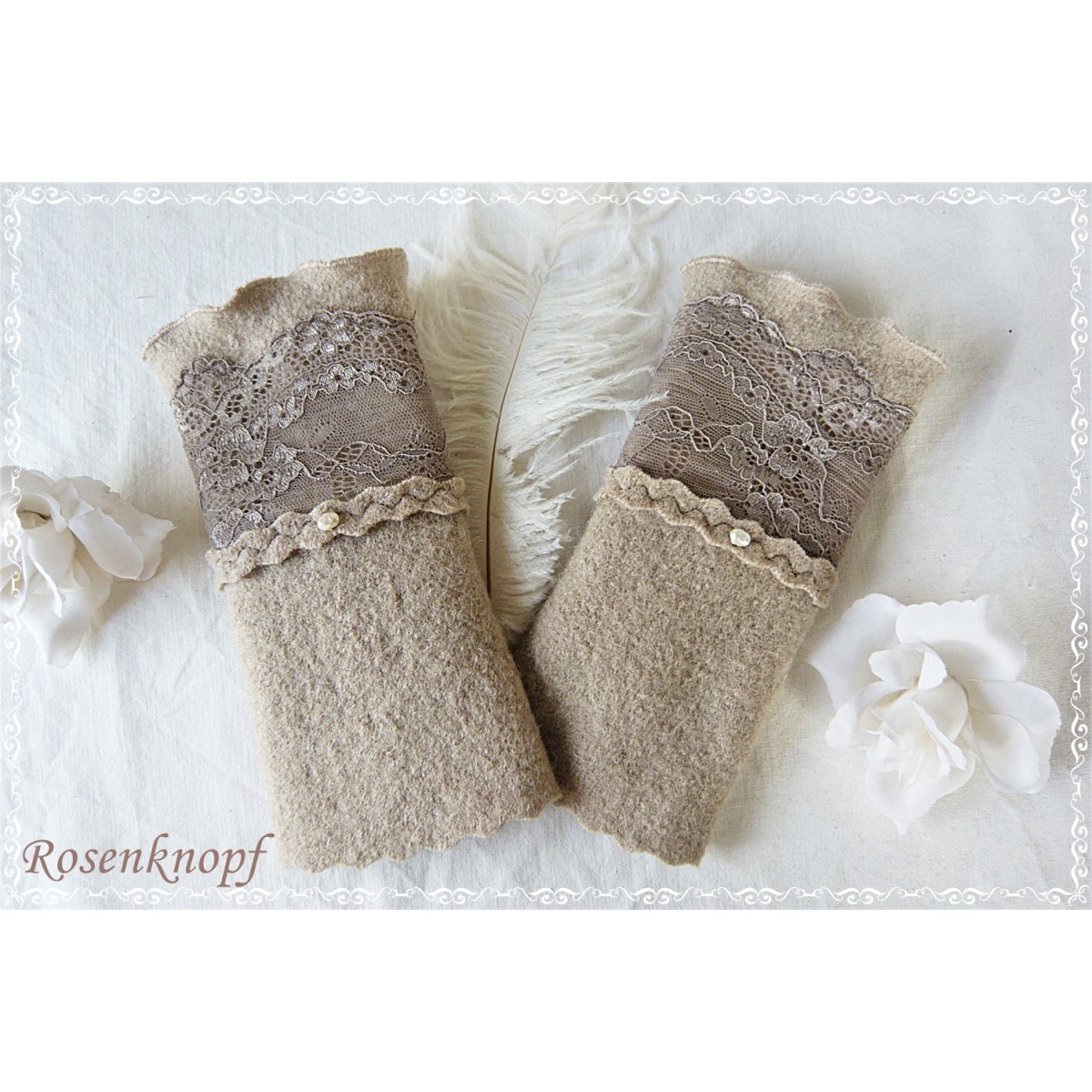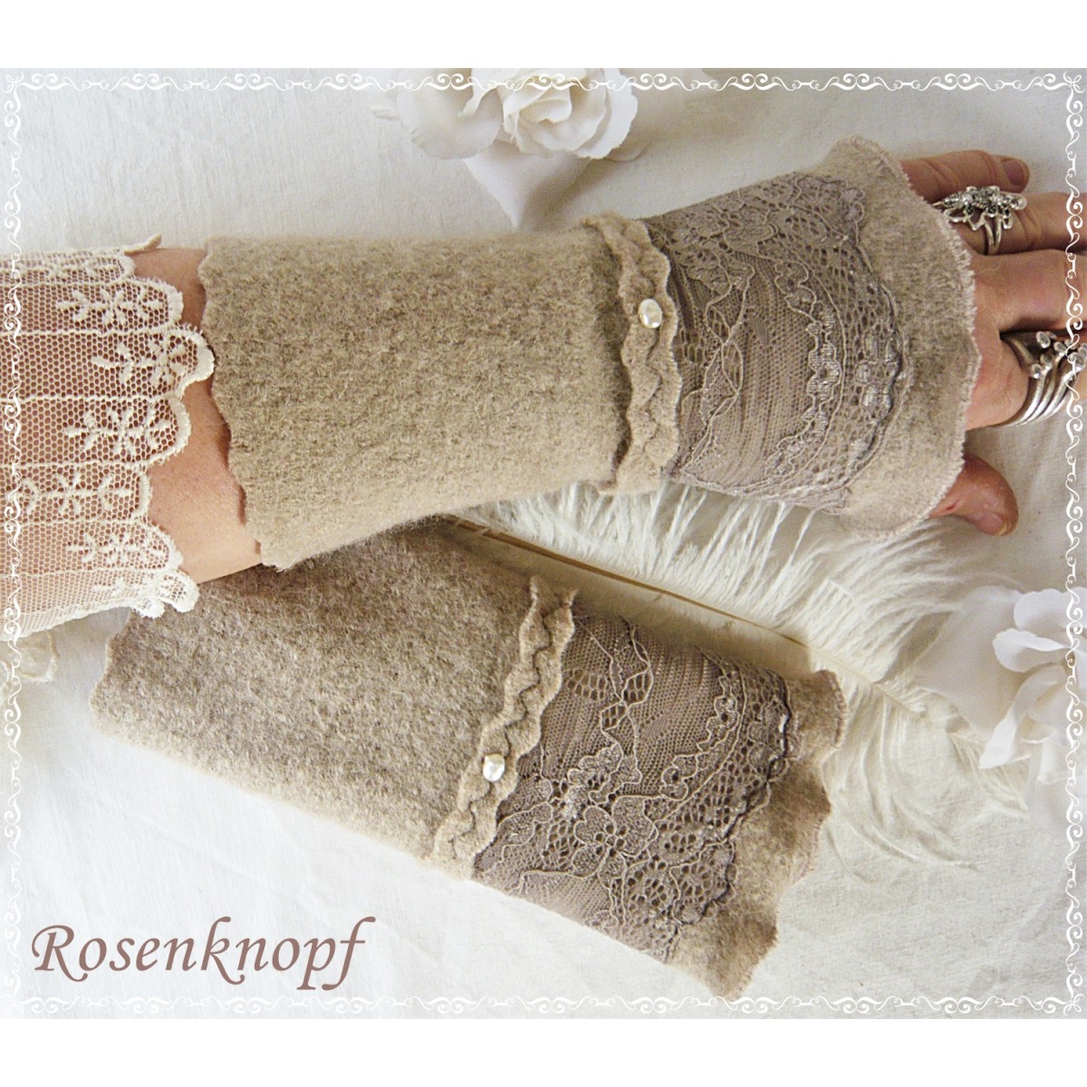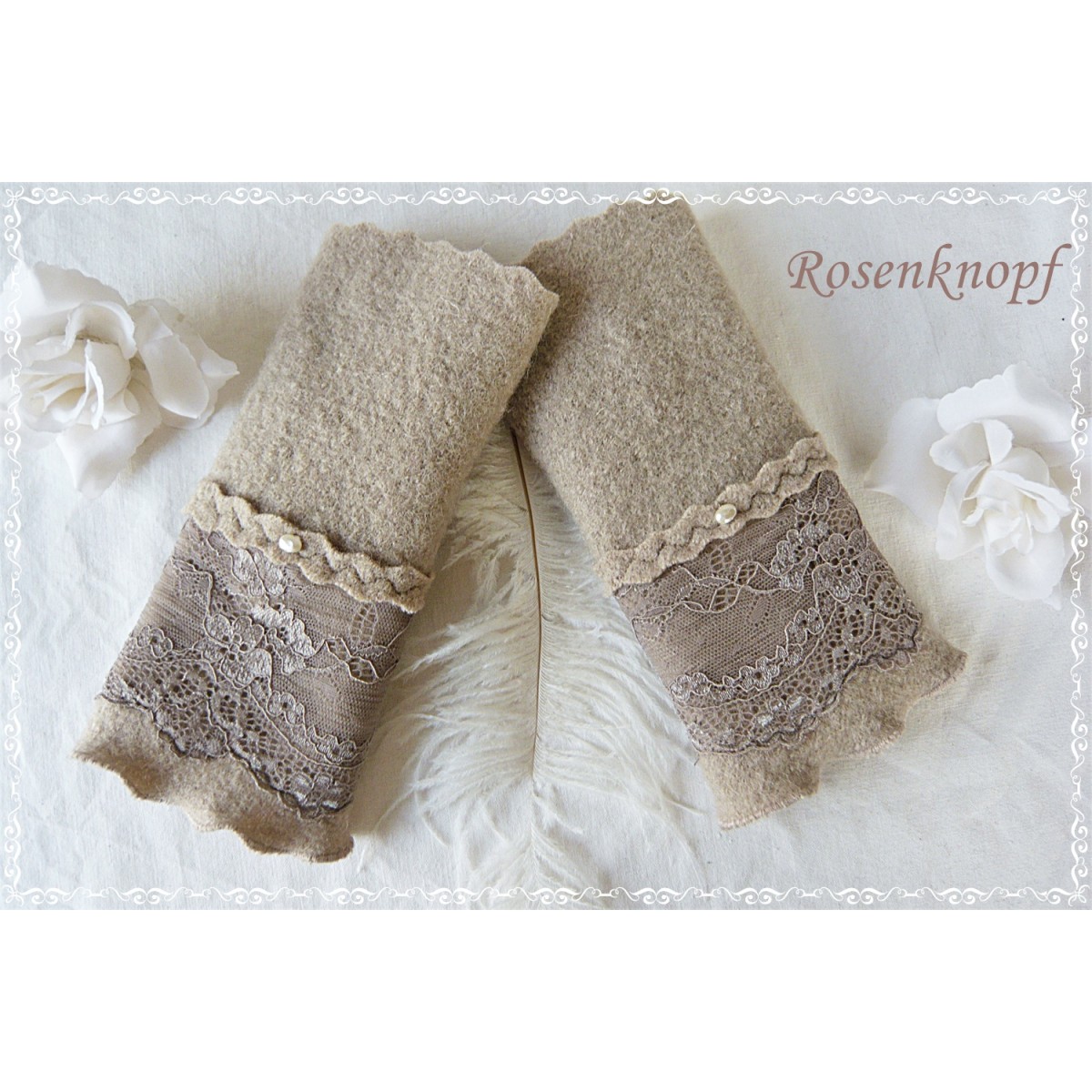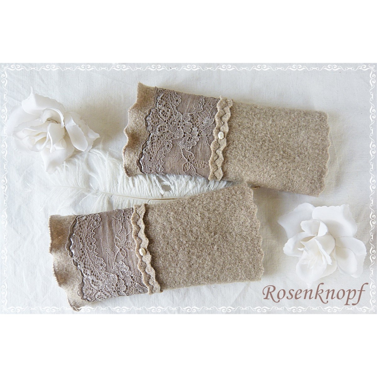 Pulswärmer/ Walkstulpen in Sand/Beige mit Spitze in Nougat, weichen Bögen und bronzefarbener Perle.
