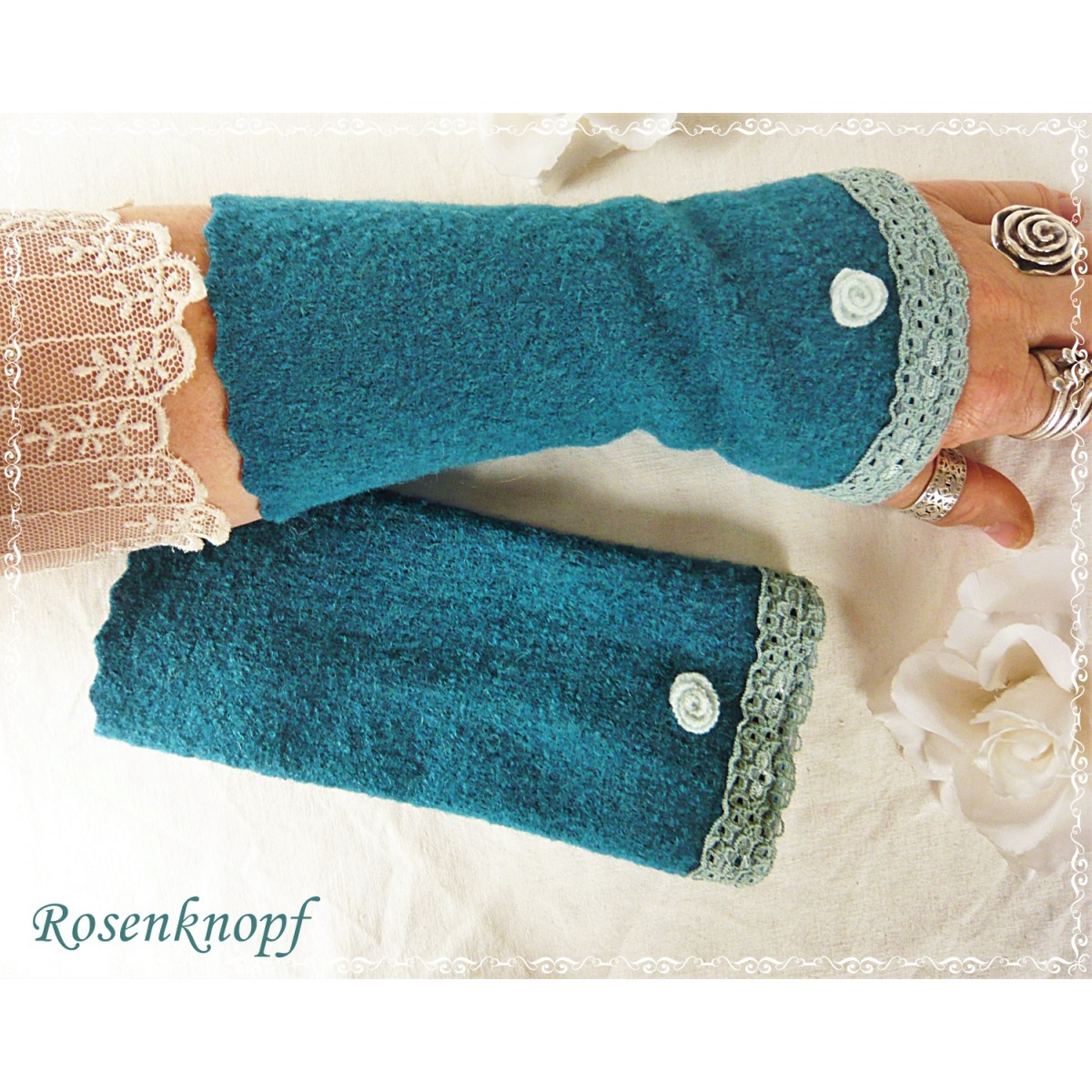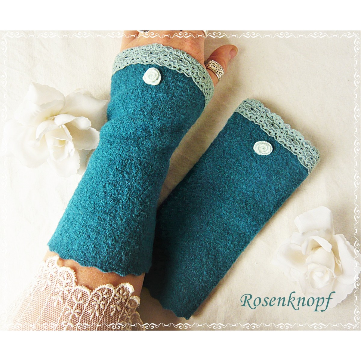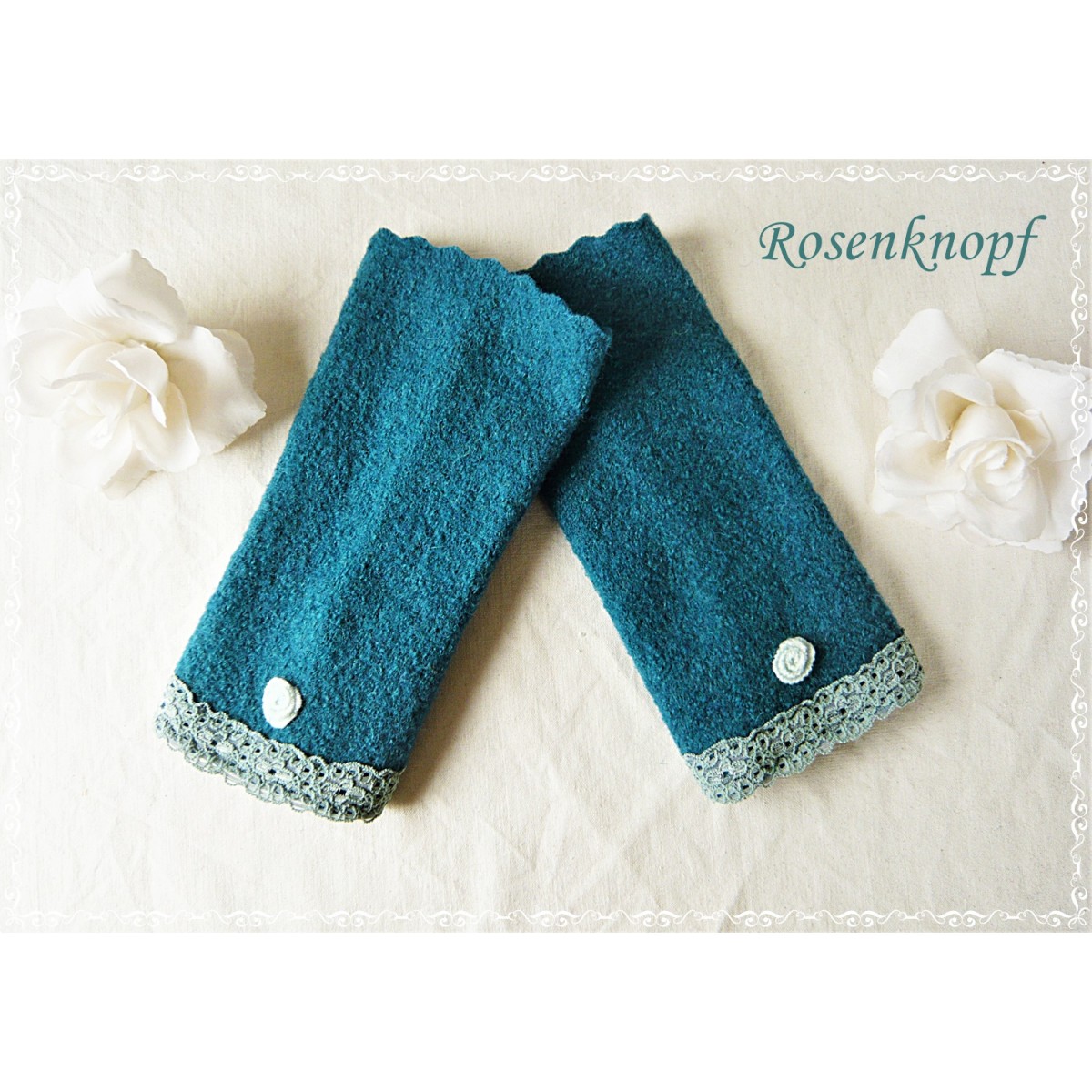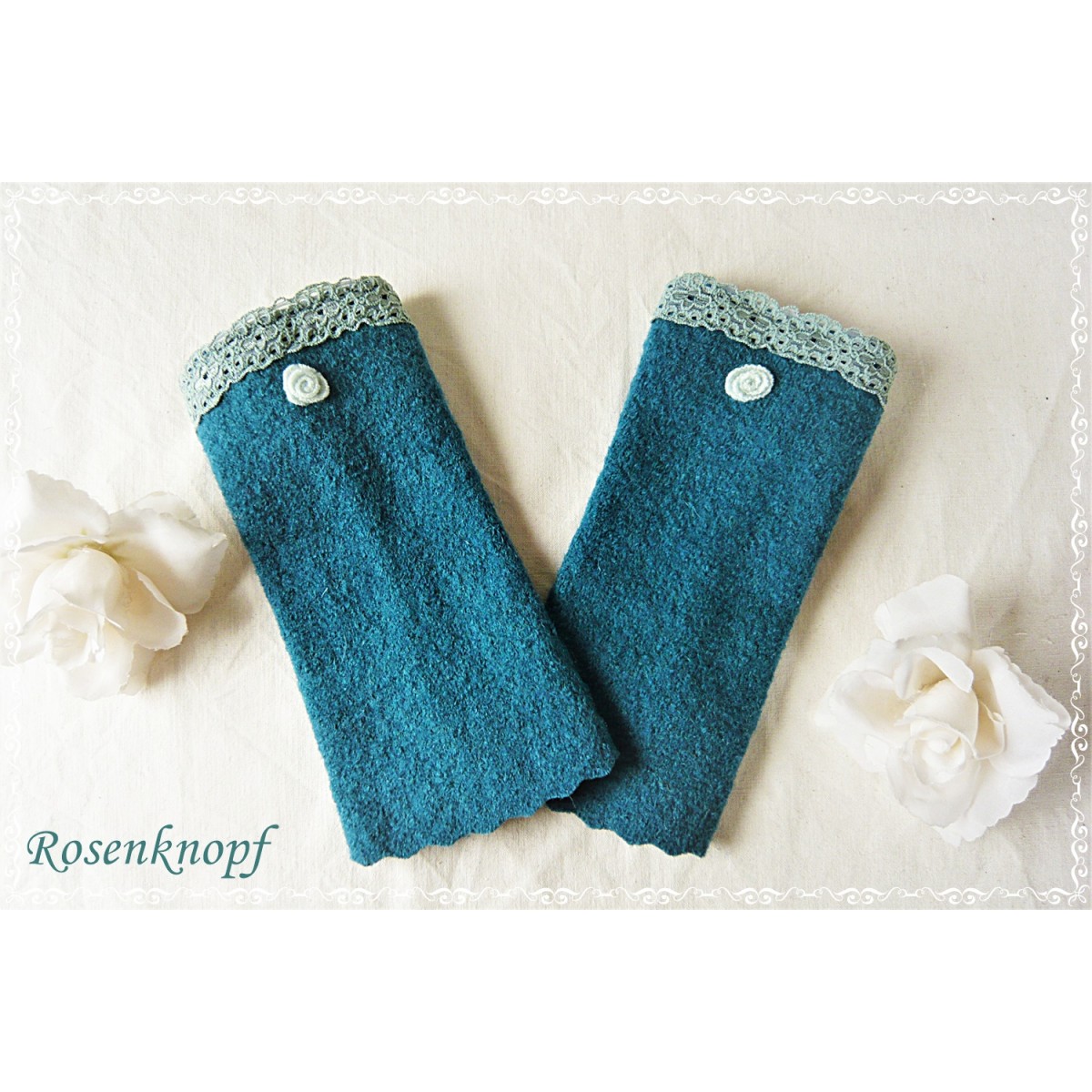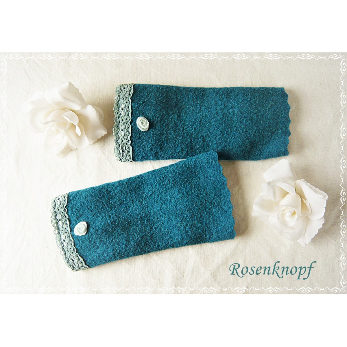 Elegante Stulpen aus hochwertigem Walk in Petrol mit aufgenähter Spitze in Mint und farblich passendem Walkröschen.