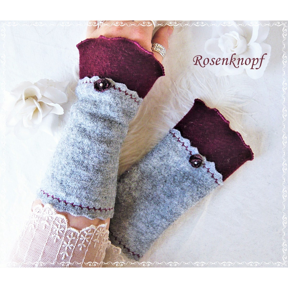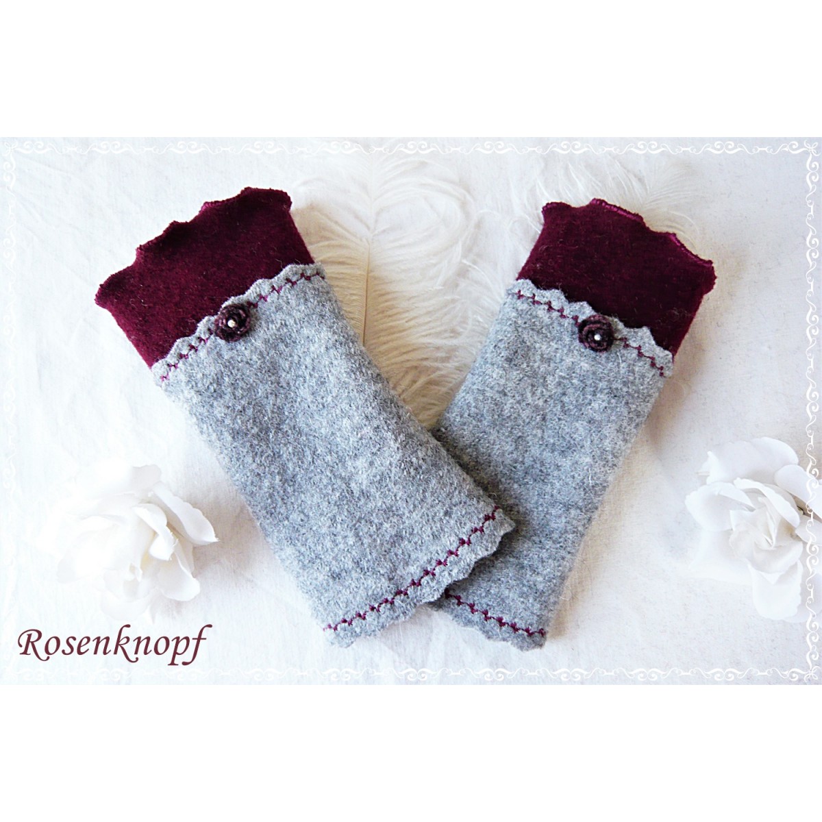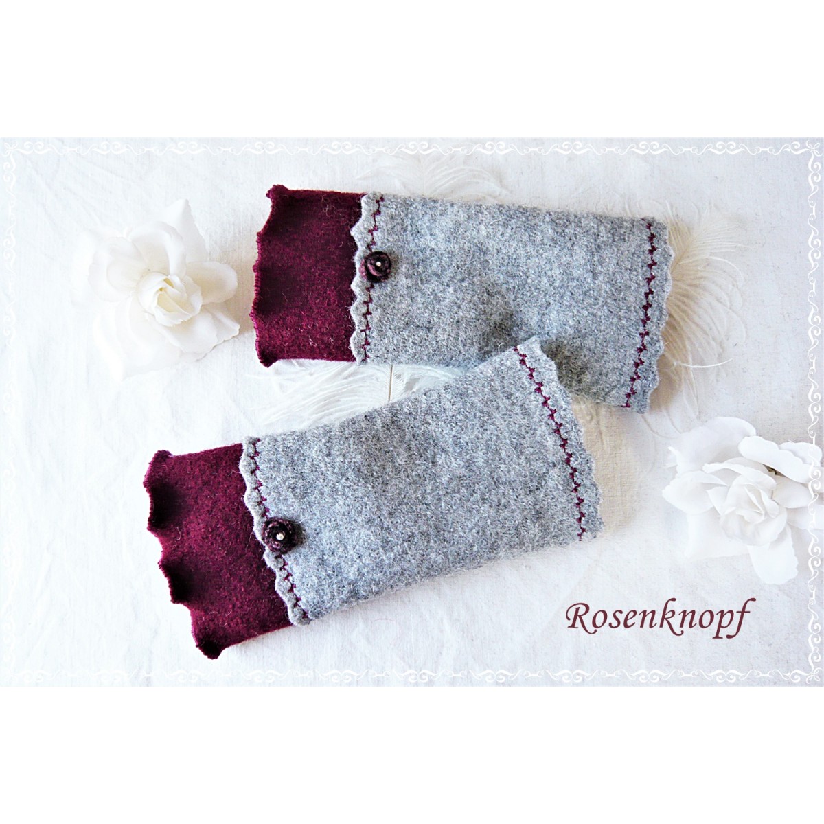 Hochwertige und pflegeleichte Walkstulpen/Pulswärmer in Grau mit angesetztem Walk in Weinrot, wellig versäumter Kante. und einem Walkröschen mit Perle.