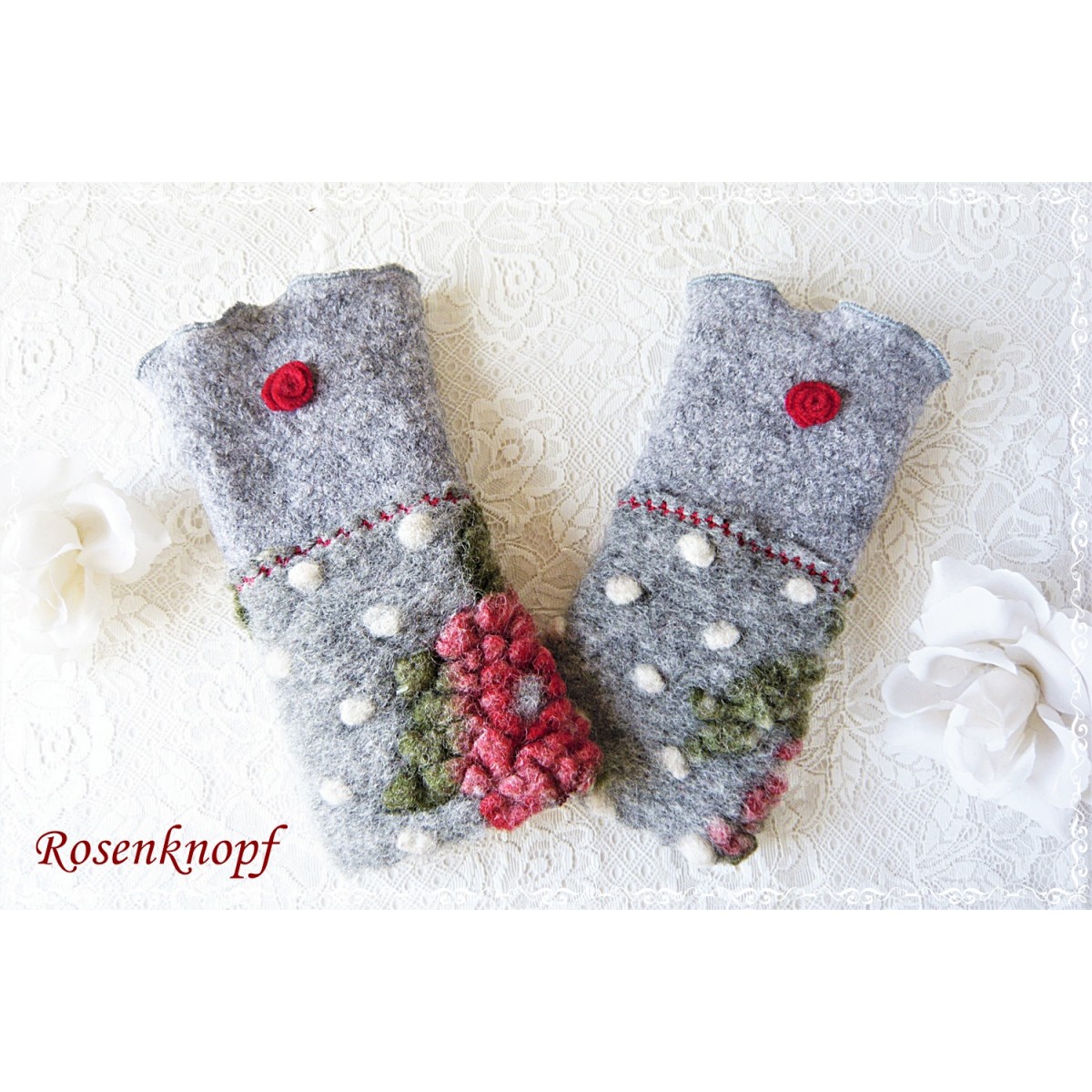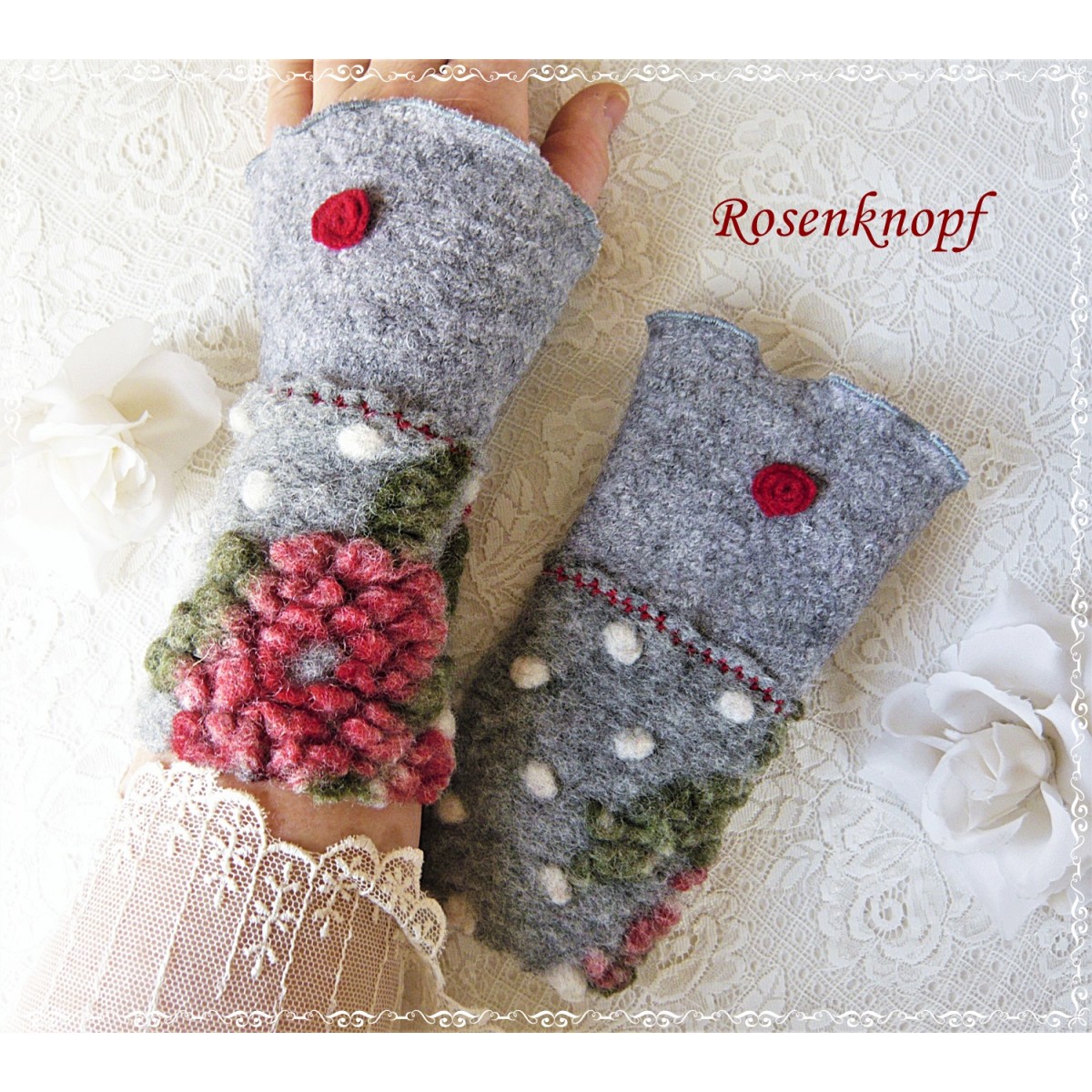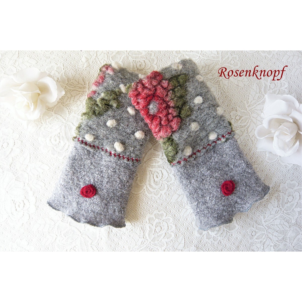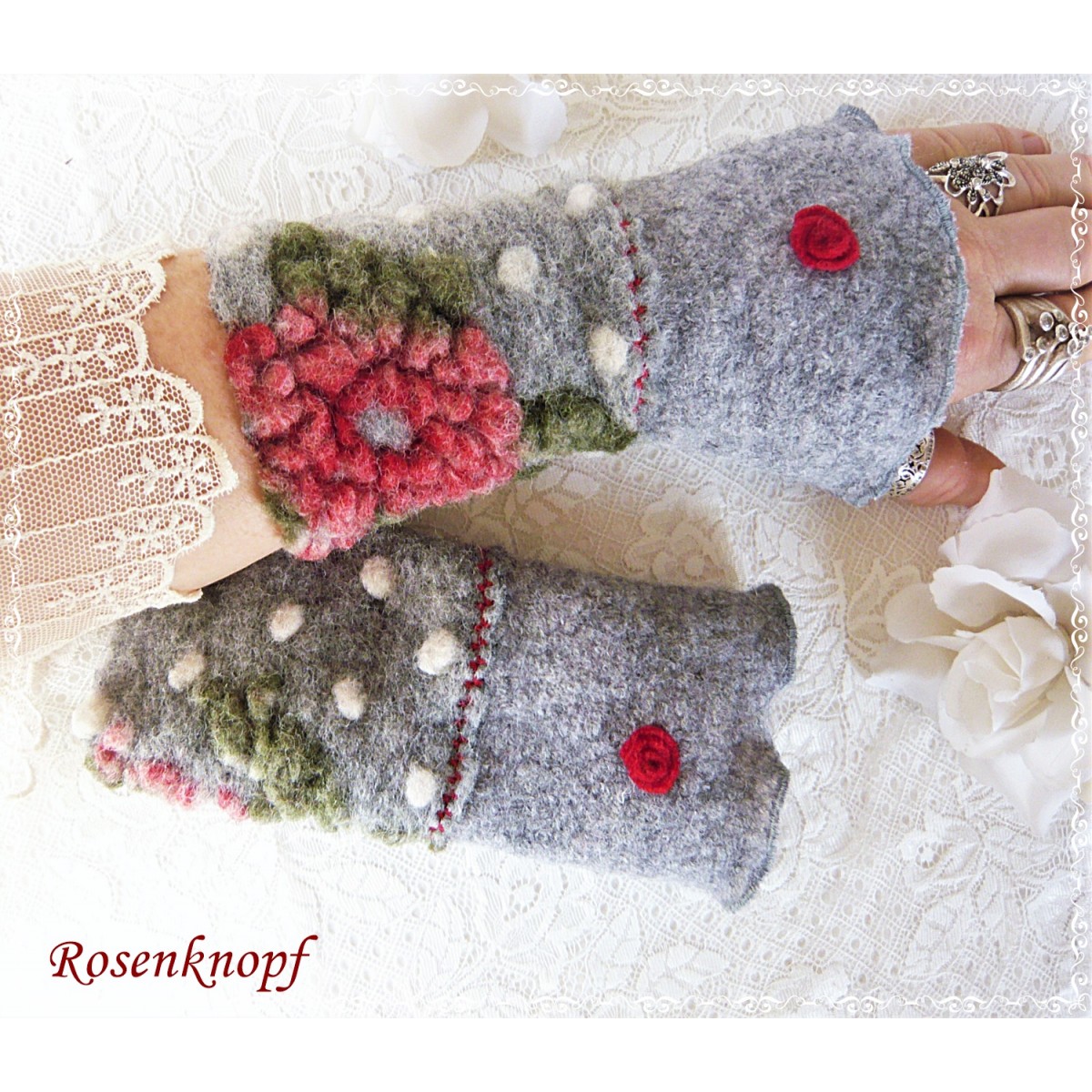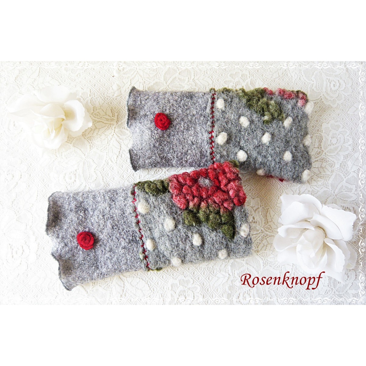 Die Damenstulpen haben vorne einem wellig versäumten Rand und ein von mir gefertigtes Walkröschen in Rot.