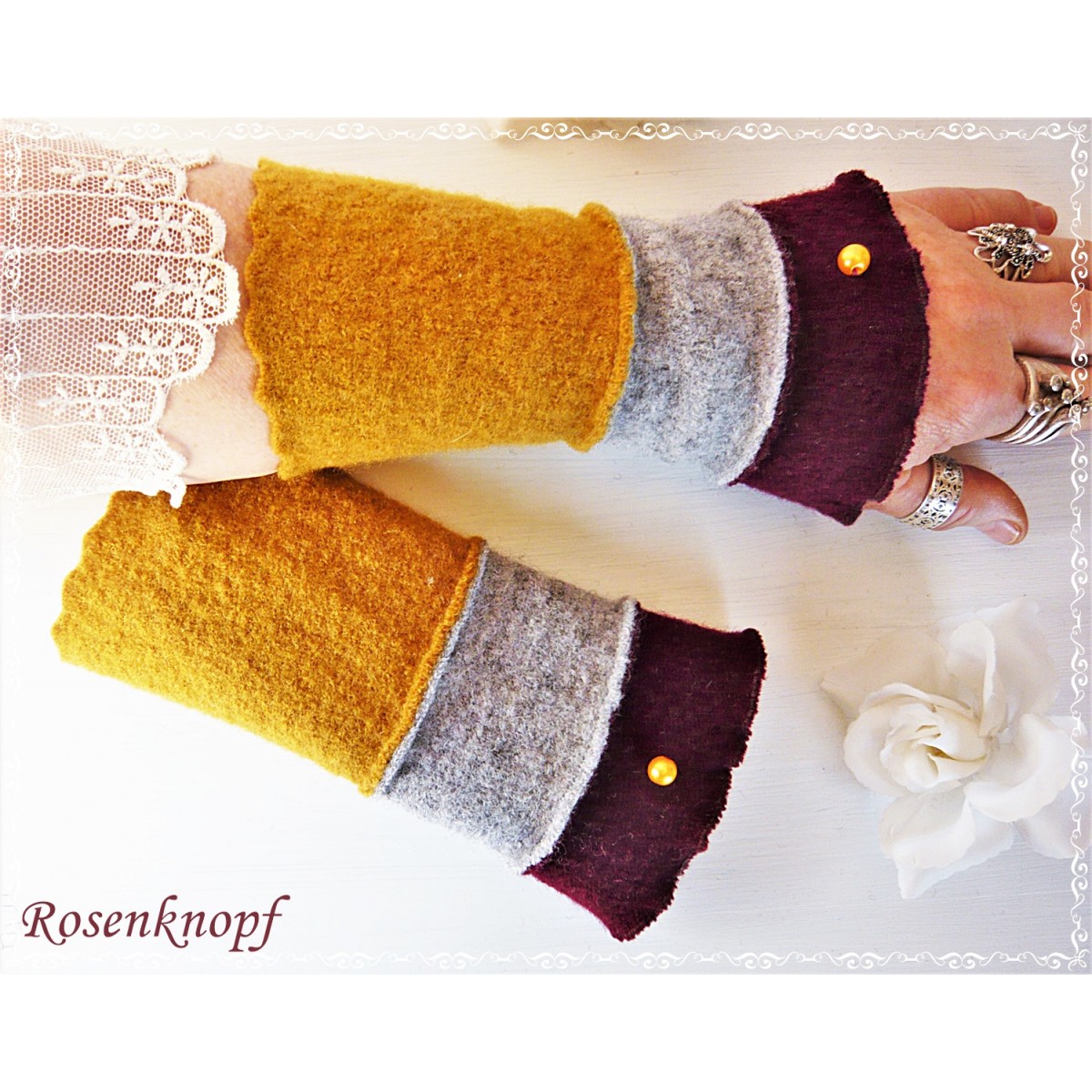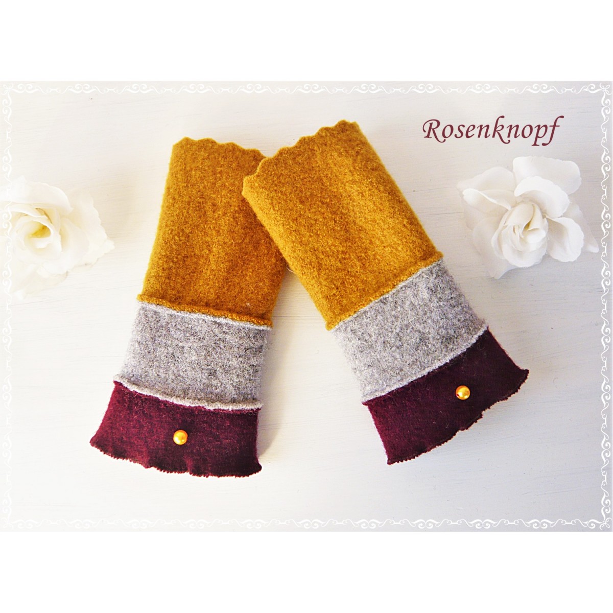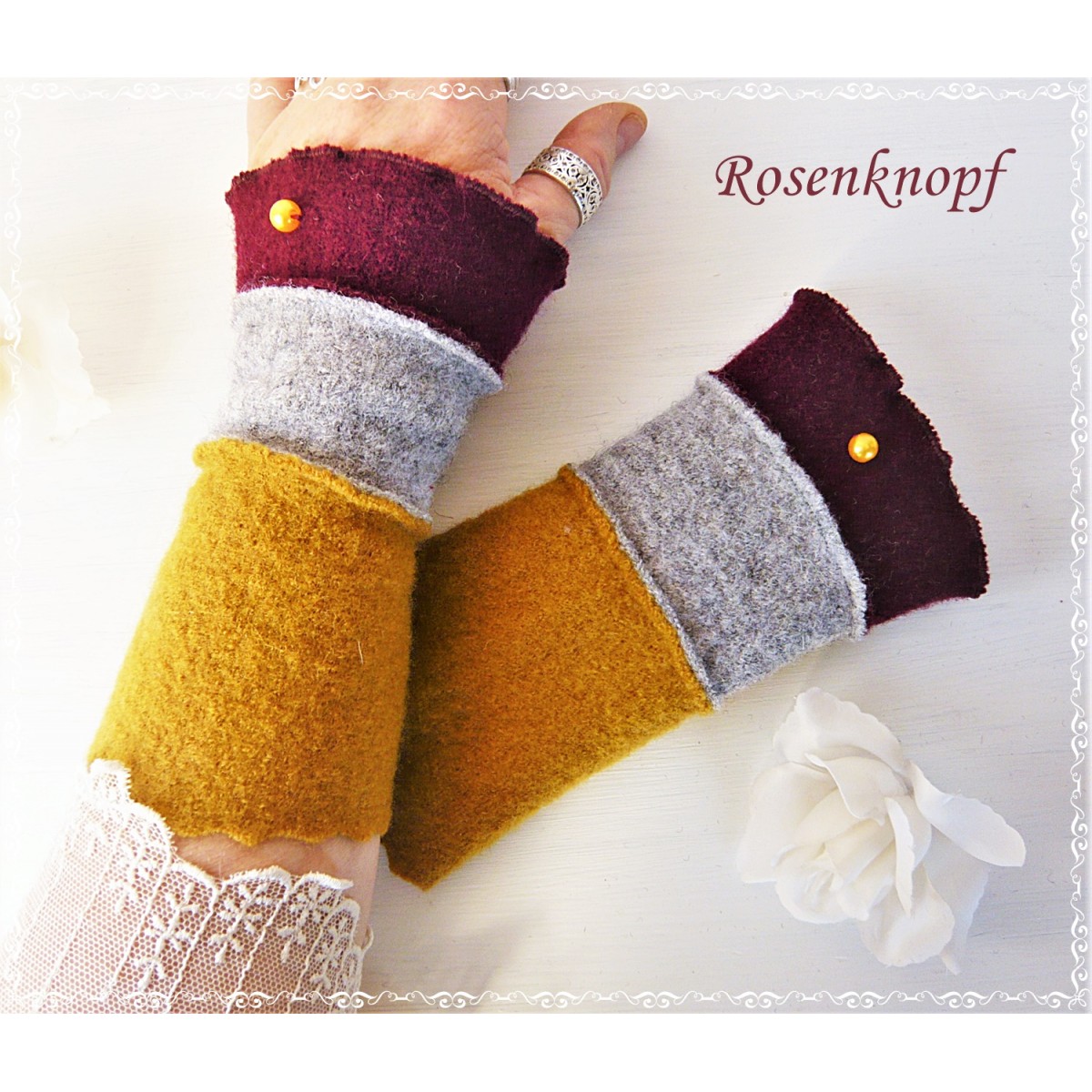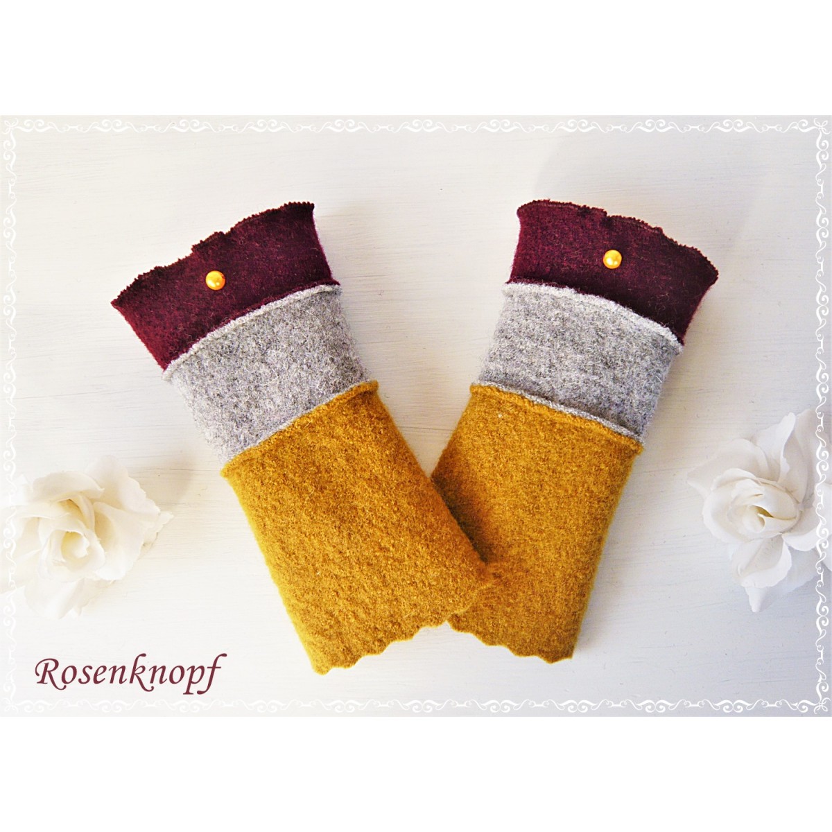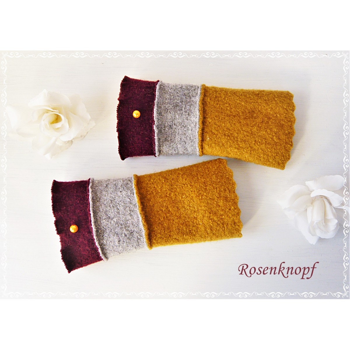 lll➤ Armstulpen/Pulswärmer aus Walk in Ockergelb, Grau, Weinrot.