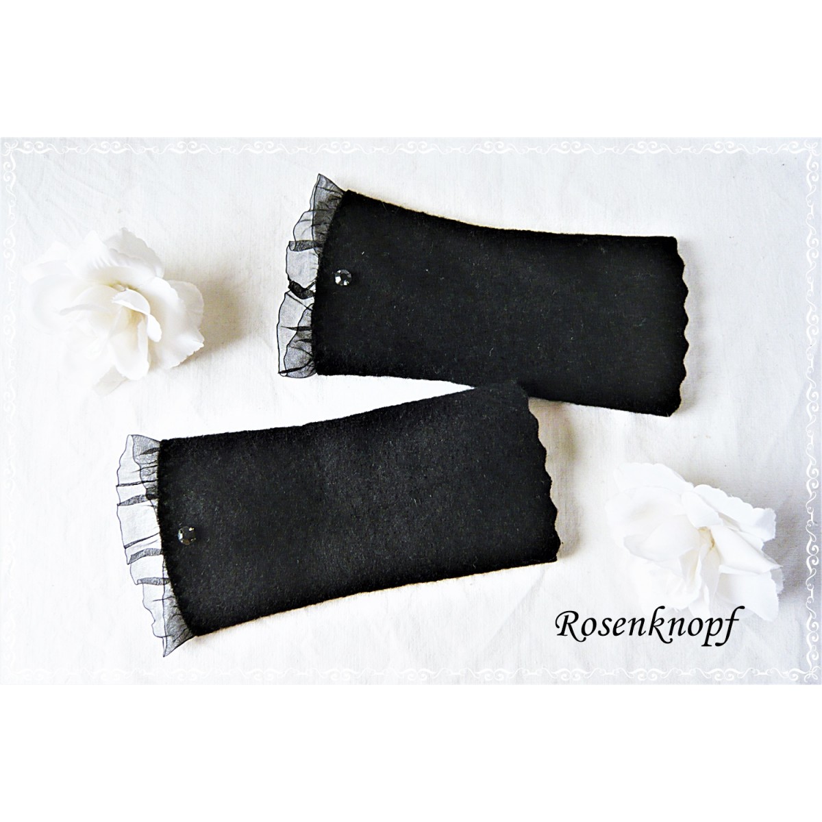 Romantische Akzente erhalten diese zeitlosen Armstulpen durch die breite Organzarüsche in Schwarz vorne und das aufgenähte runde Schmuckelement mit schwarzem, facettiertem Kunststein.