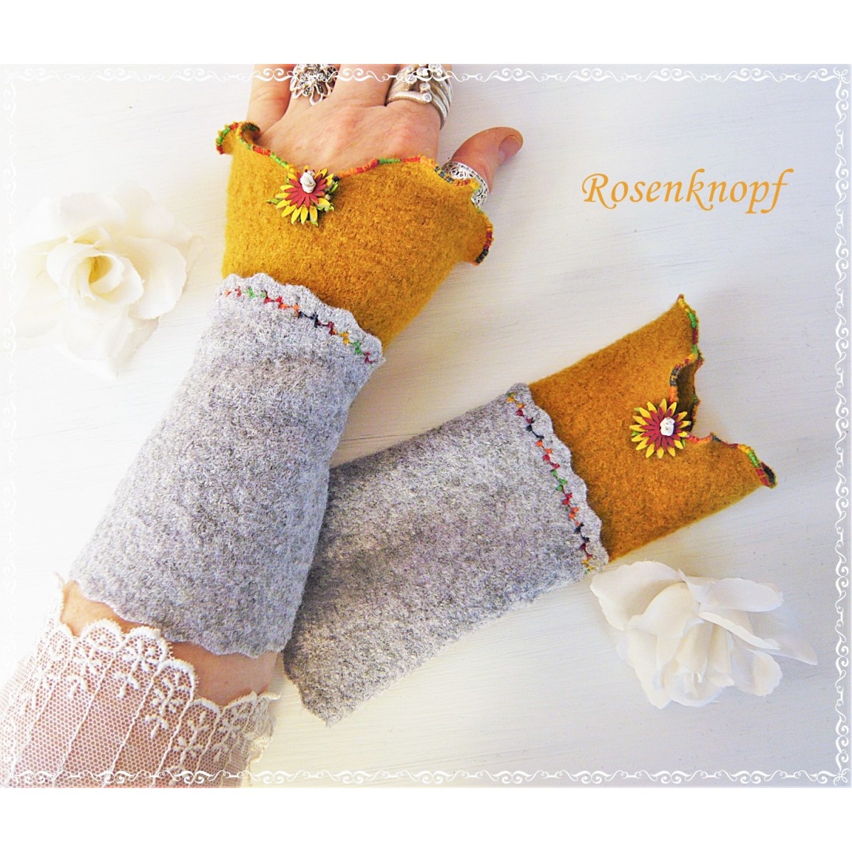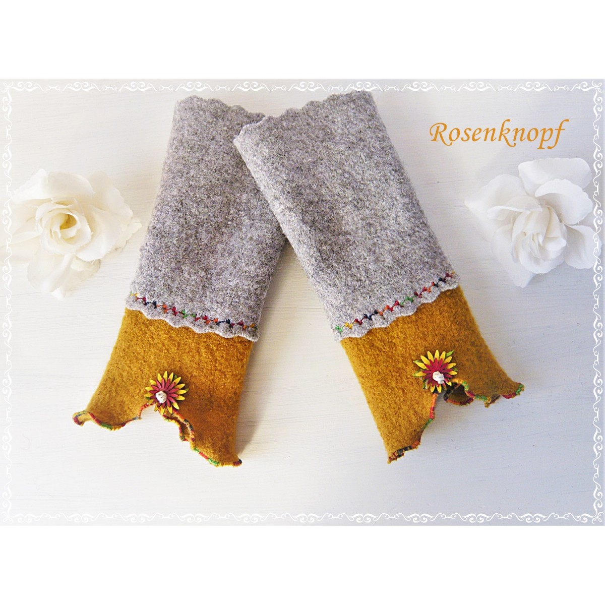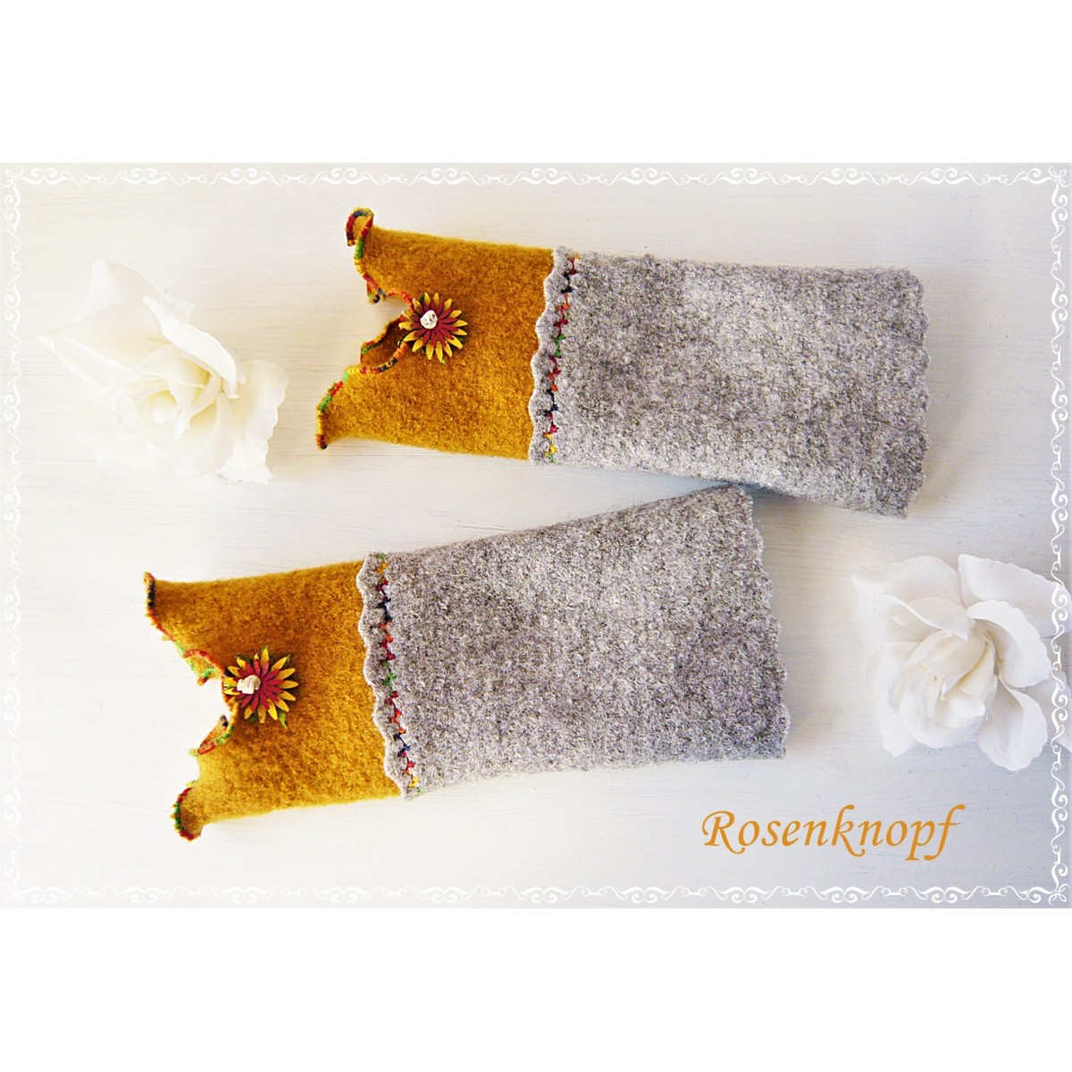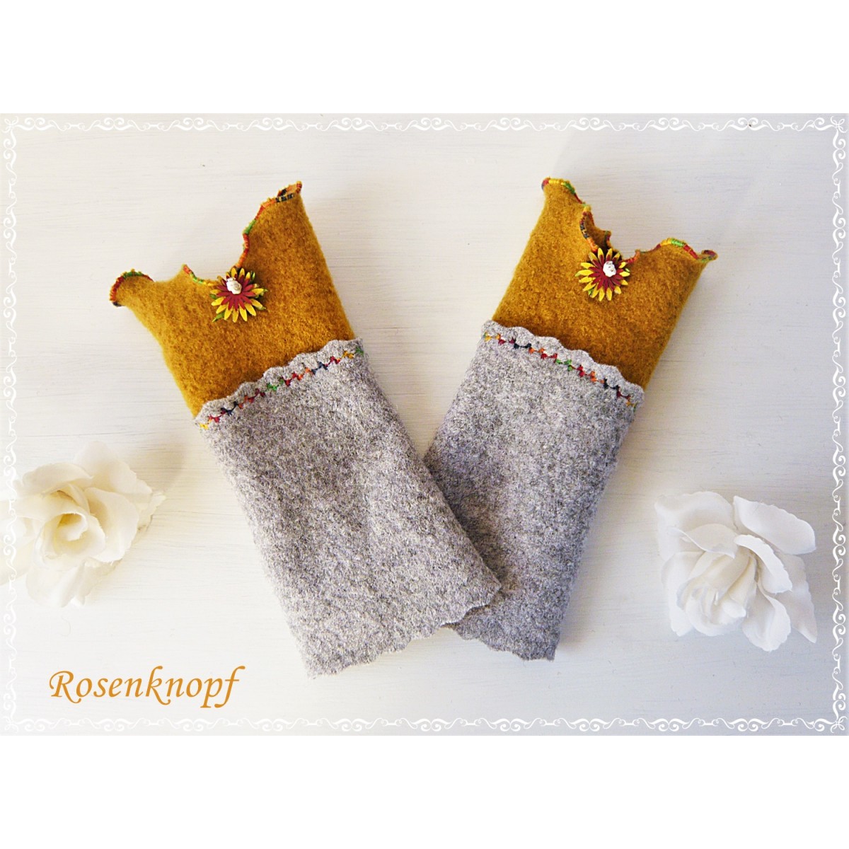 Die Damenstulpen haben einen angesetzten Walkstreifen in Ocker mit Regenbogengarn versäumten Bögen, Lederblume und bunter Ziernaht.