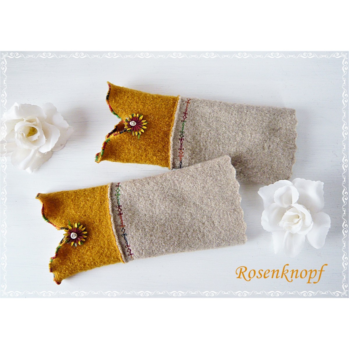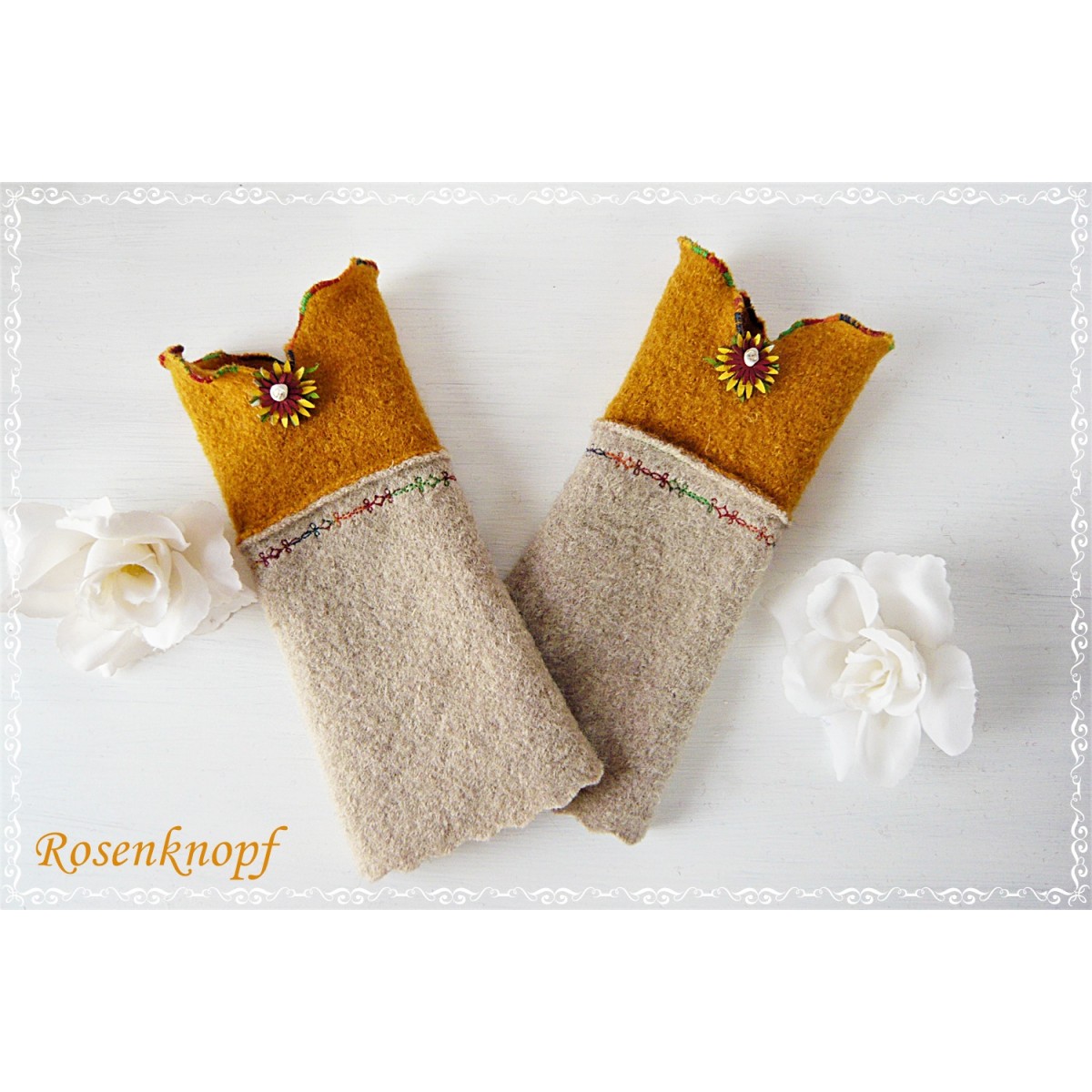 Die Damenstulpen ziert Walk in Ocker mit wellig versäumten Bögen und auffällige Kunstlederblümchen in der Schnittmitte.