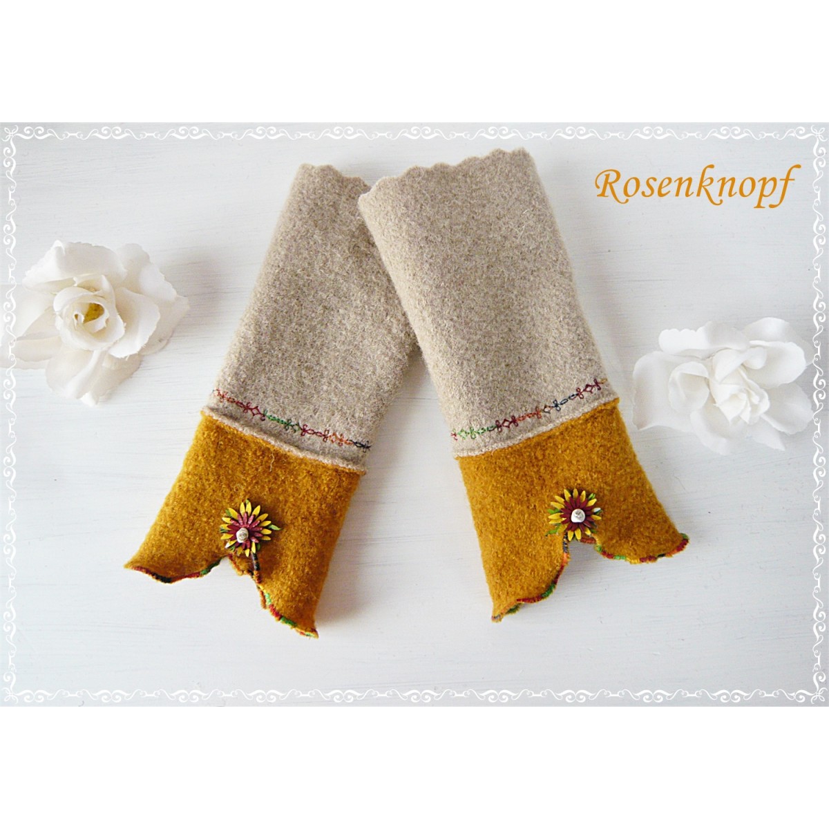 lll➤ Armstulpen, Pulswärmer aus Walkloden in Sand zur Hochzeit, Standesamt, Fest.