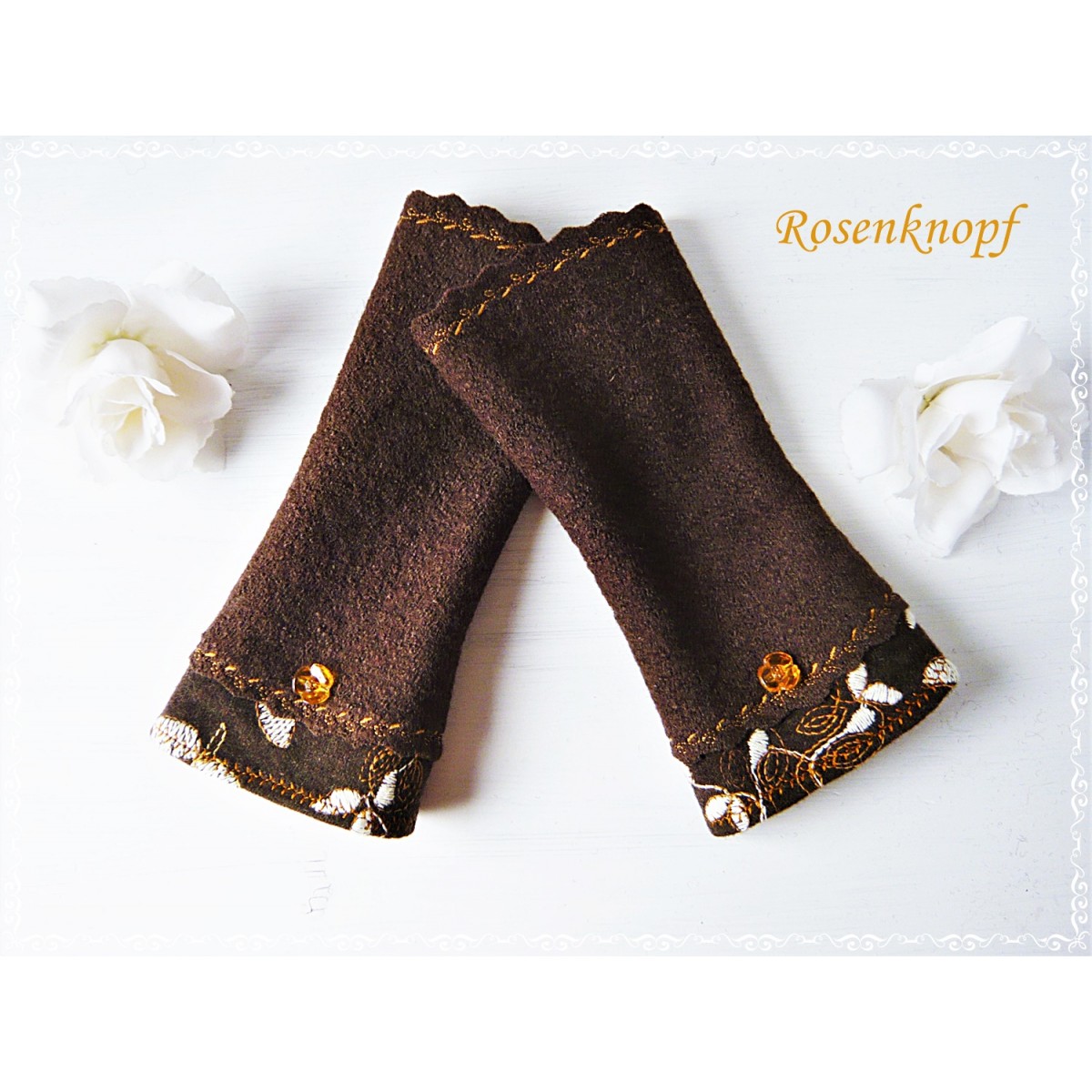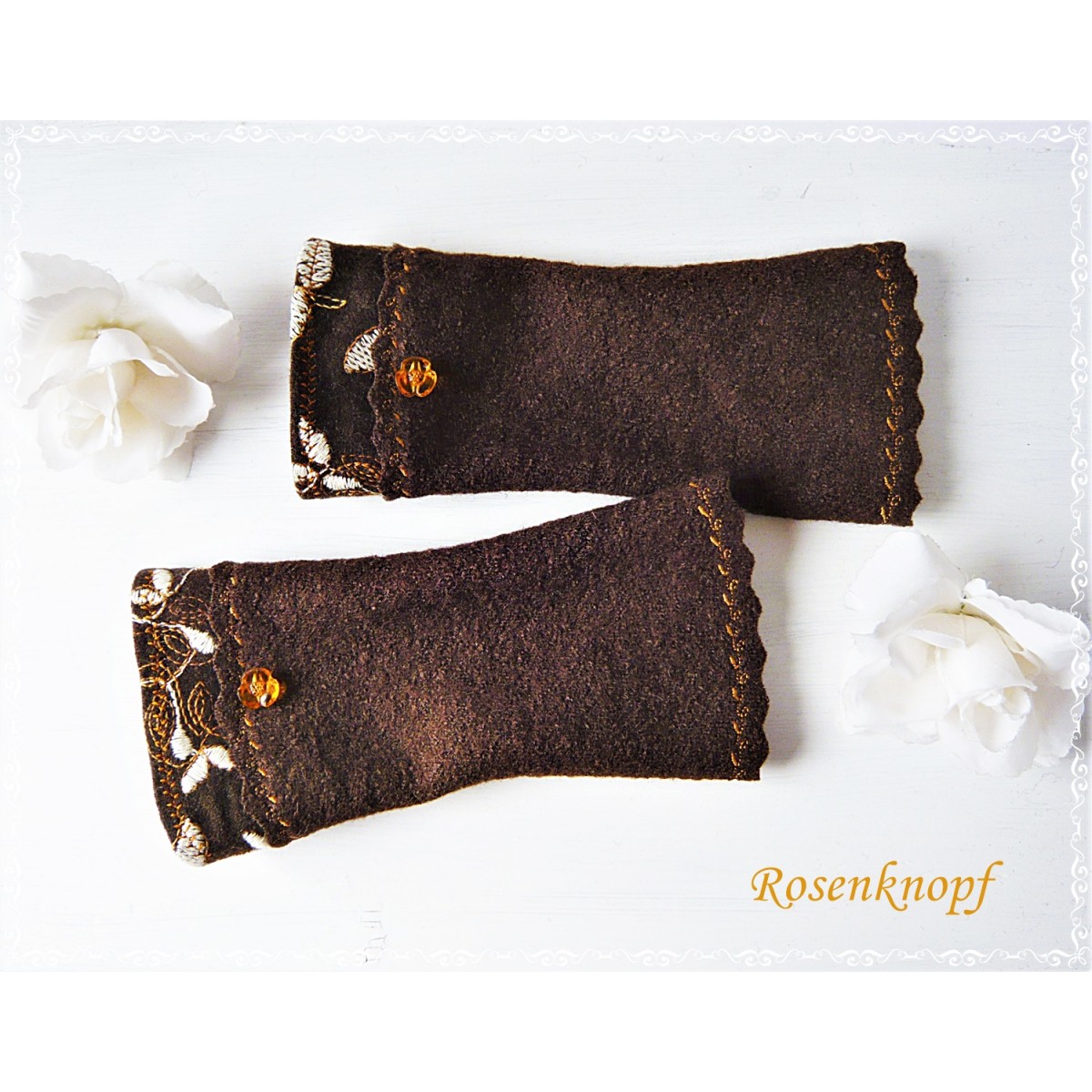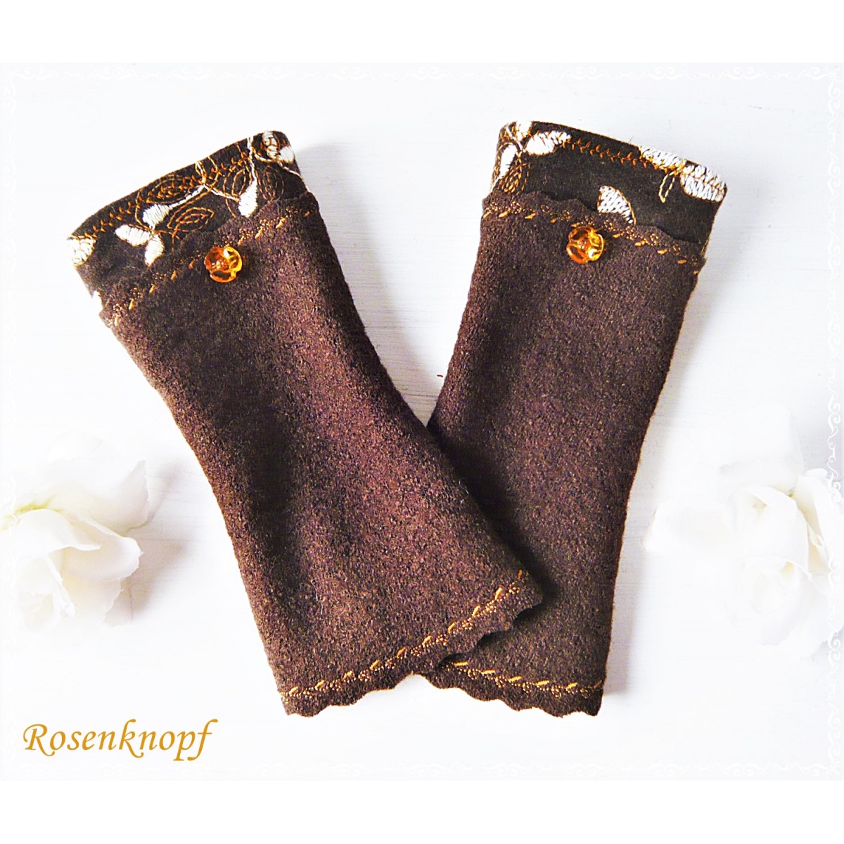 lll➤ Armstulpen, Pulswärmer aus Walk in Dunkelbraun und angesetztem Wollstoff mit Stickerei, wellig versäumter Kante und farblich passendem floralem Knopf in Ocker.