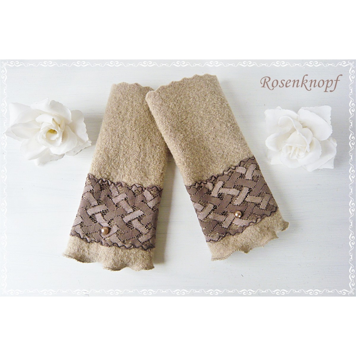 lll➤ Armstulpen/Pulswärmer aus Wollwalk in Sand/Beige in Größe L für Ricarda.