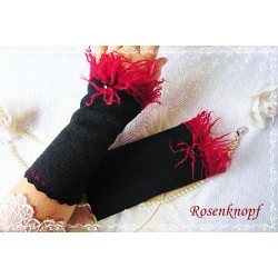 UNIKAT♥ Elegante Walkstulpen für kühle Tage. "ALINA" wurden aus hochwertigem Walk in Schwarz genäht, der vordere Teil setzt sich aus zwei roten Walkteilen zusammen.Romantische Akzente erhalten die Armstulpen durch das Walkröschen in Schwarz, versäumten Bögen und Ziernähten. Die Stulpen enden in einer verzierten Welle.