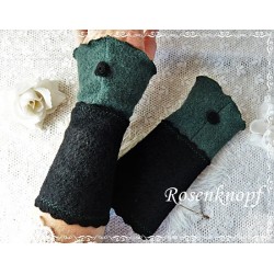 UNIKAT♥ Elegante Walkstulpen für kühle Tage. "NOSELY" wurden aus hochwertigem Walk in Schwarz gefertigt. Romantische Akzente erhalten die Armstulpen durch den angesetzten Walk in dunklem Tannengrün mit versäumter Kante und das Walkröschen. Die Stulpen enden in einer verzierten Welle.