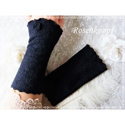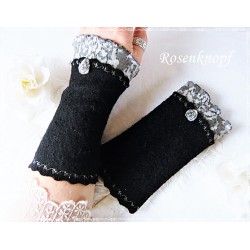 Wunderschöne und elegante Walkstulpen für kühle Tage."TESSY" wurden aus hochwertigem Walk in Schwarz gefertigt.Romantische Akzente erhalten die Armstulpen durch die zarte Spitzenborte vorne und der kleinen, von mir in Handarbeit gefertigten Walkrose.Pulswärmer eignen sich zudem ganz sicher auch als ein gern gesehenes Geschenk für Ihre Ehefrau, Freundin,...