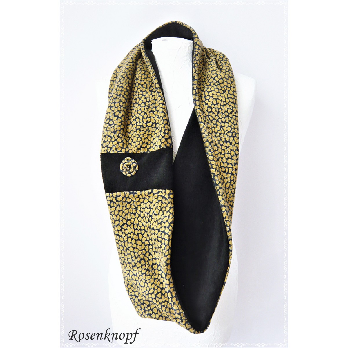 Der Ringschal wurde aus schwarzem weichem Stoff in Frotteeoptik mit unregelmäßigen Punkten in Ocker gefertigt.