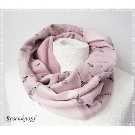 Einzigartiger und zeitloser Loopschal der aus Double Gaze Musselin in Altrosa mit bedruckten Röschen in Schwarz gefertigt wurde.