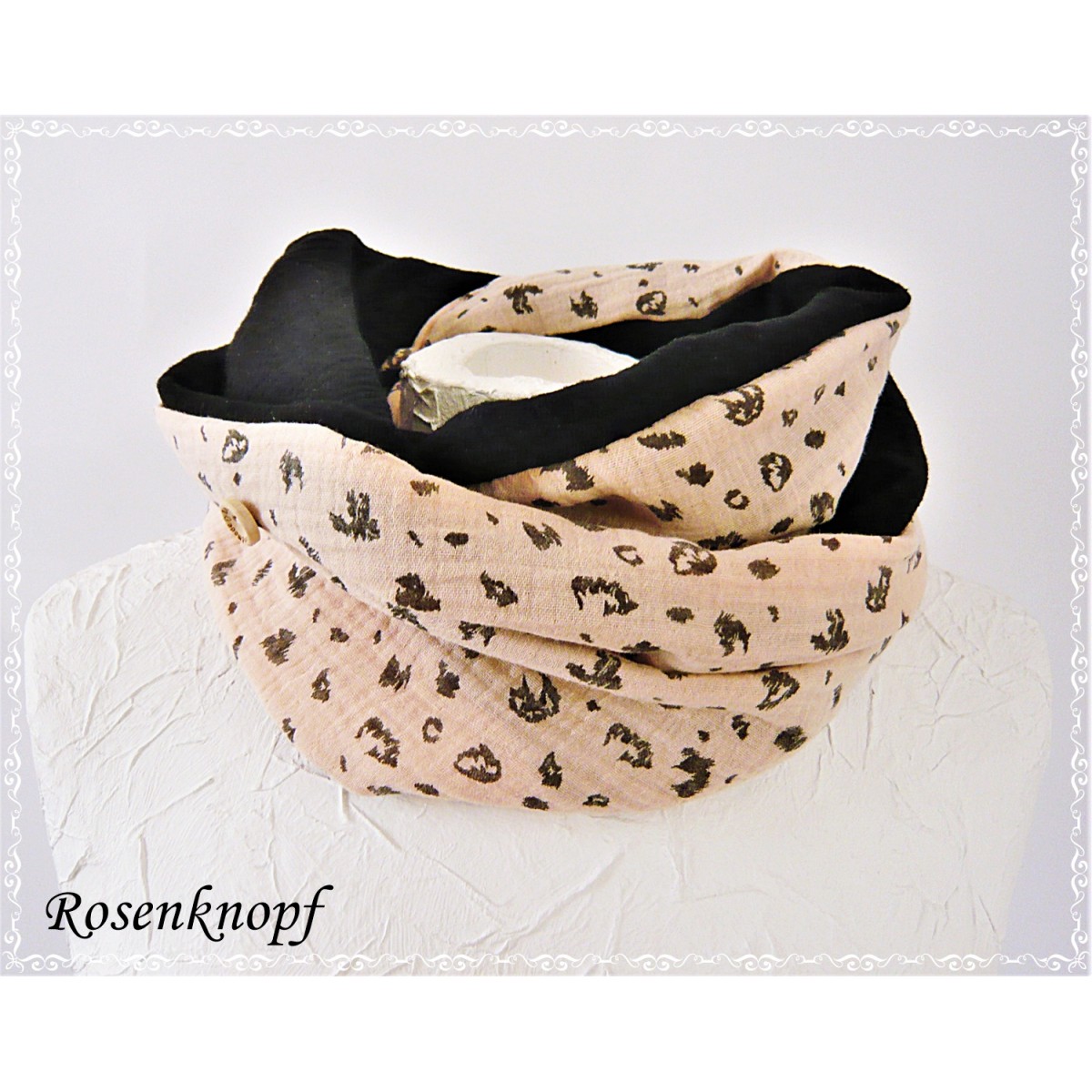 Einzigartiger und zeitloser Loop/Schal der aus Double Gaze Musselin in Apricot/Puder mit bedruckten Fellmuster in Anthrazit gefertigt wurde.