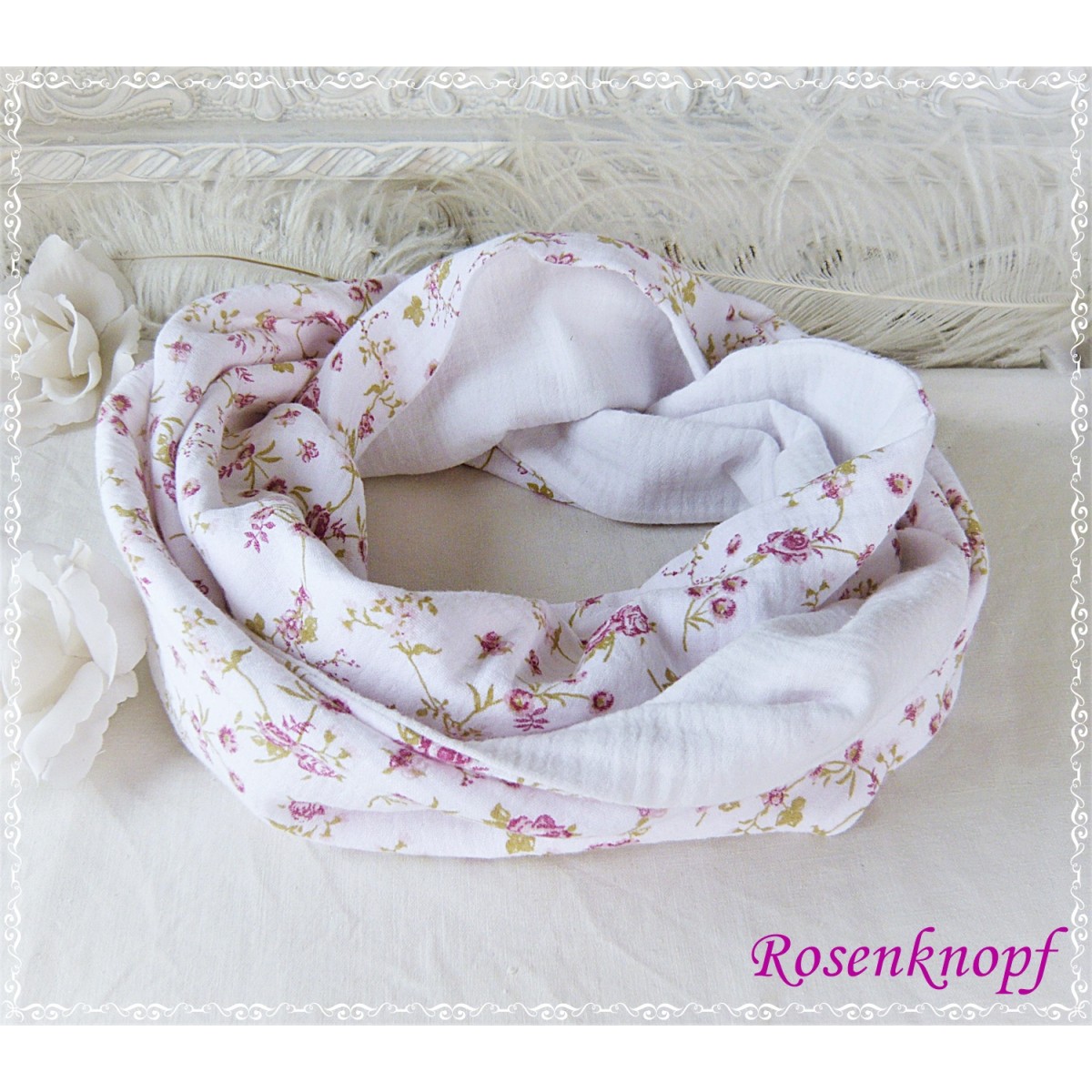 Einzigartiger und zeitloser Loopschal aus Double Gaze Musselin in Weiß und weißem Musselin mit Röschenprint in Rosa und hellem Grün gefertigt wurde.