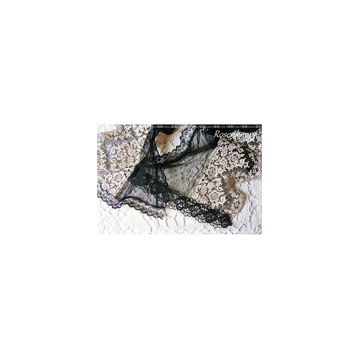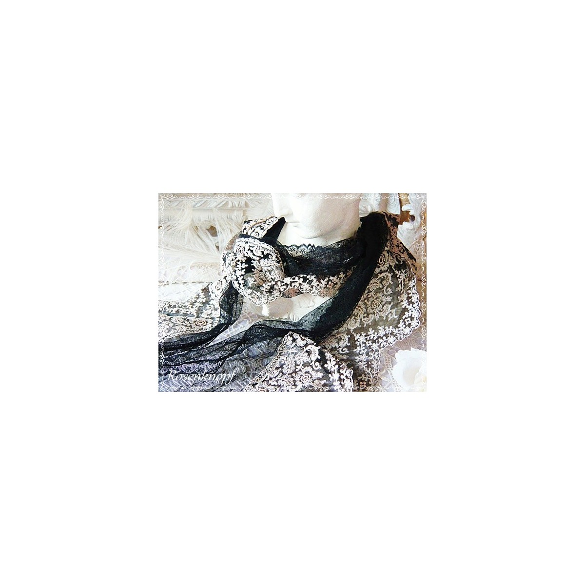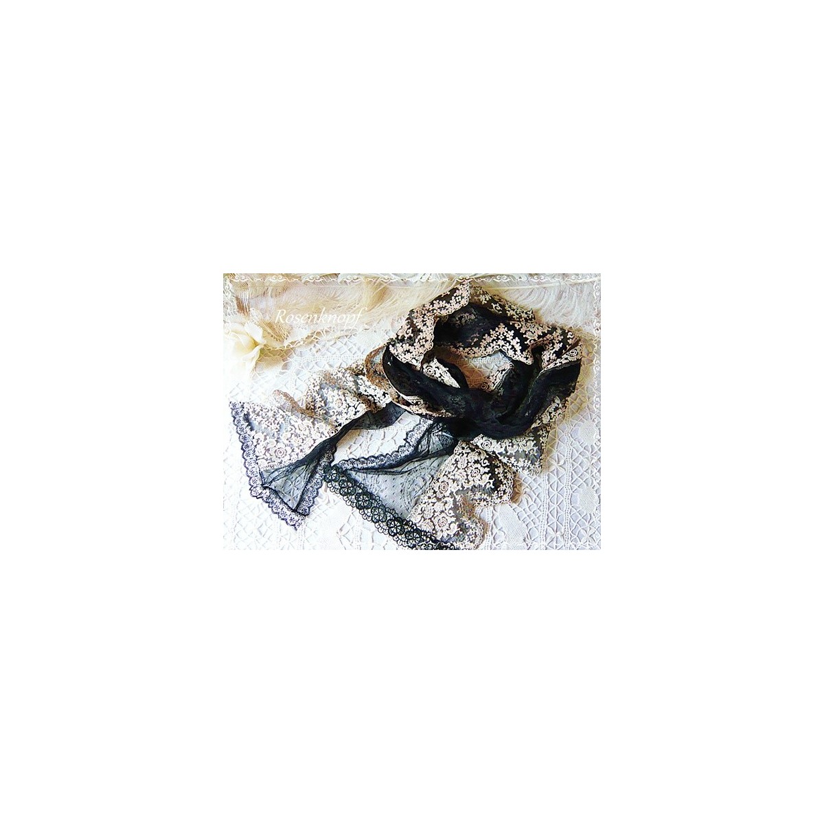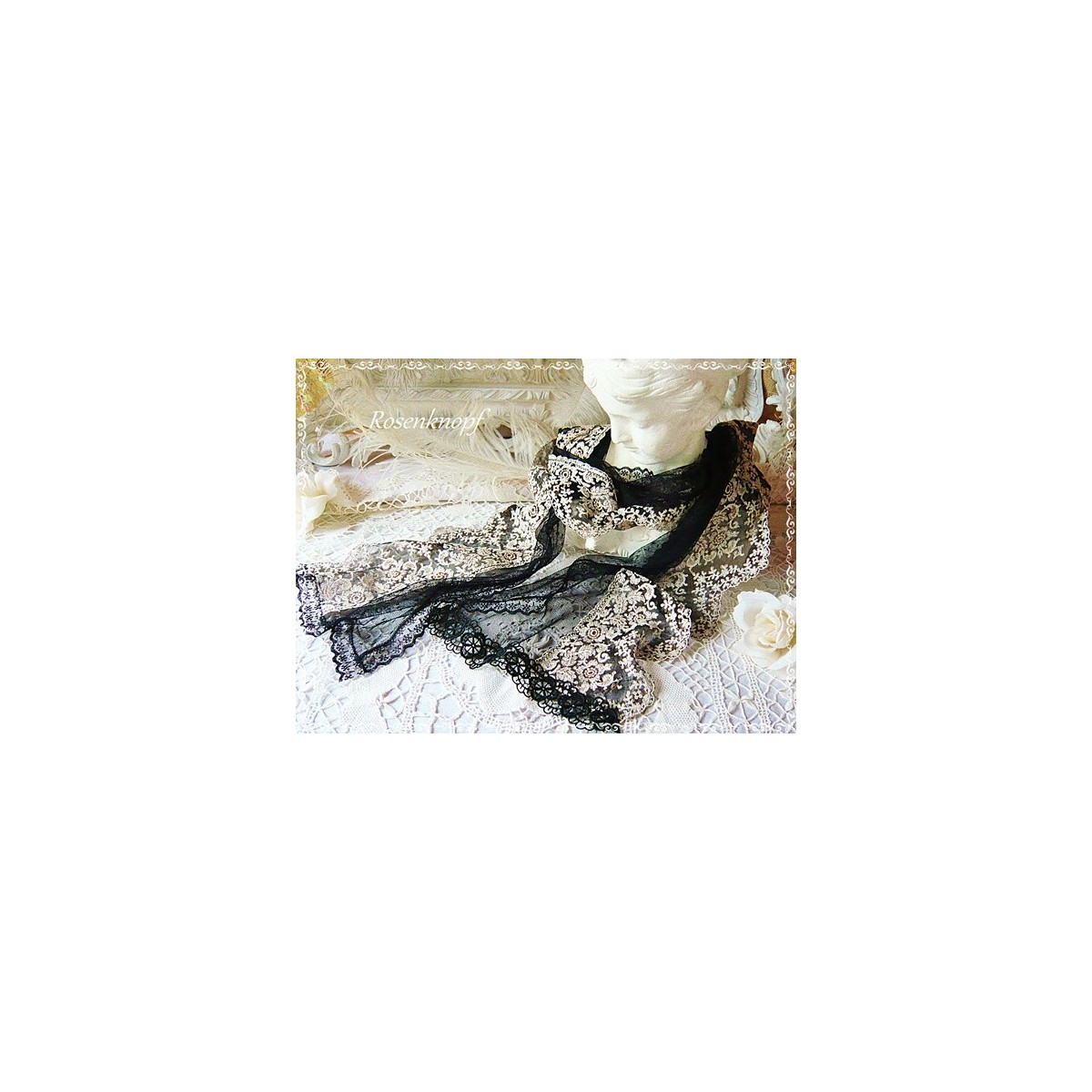 Romantisch elegante Akzente erhält dieses lange Tuch durch kostbare französische Vintage Spitze mit floraler Stickerei in Ivory und schwarzen Spitzen an seinen Längsseiten.