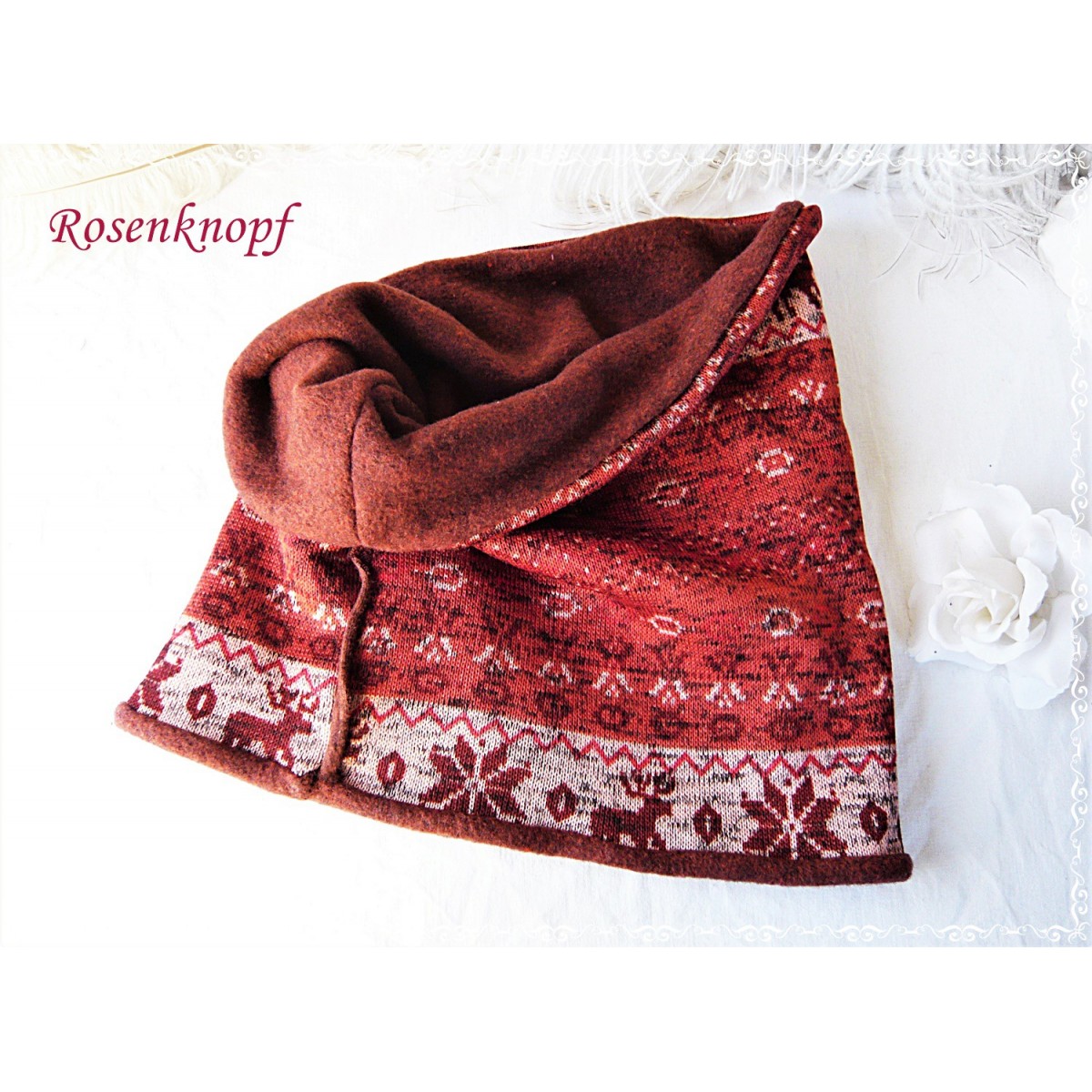 "ROSETTE" ist ein zeitloser Damenschlupfschal aus kuschelweichem, elastischem Strickstoff mit schmuckem Norwegermuster mit Rentieren in den Farben Rostrot, Weinrot und Ivory.