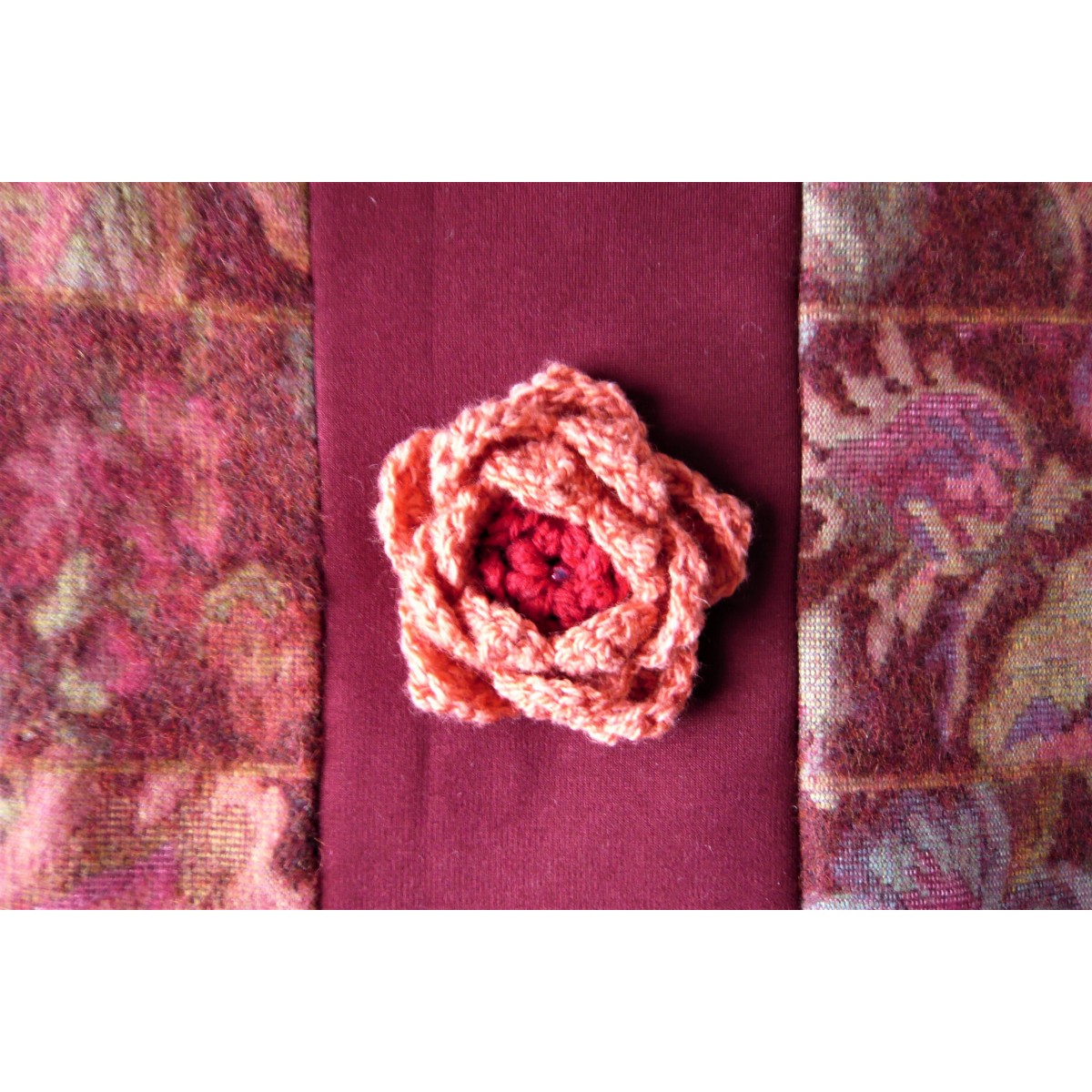 Akzente setzt die von mir in Handarbeit gehäkelte Blüte mit einer kleinen Perle in der Mitte, die auf einem eingearbeiteten weinroten Jerseystreifen sitzt.
