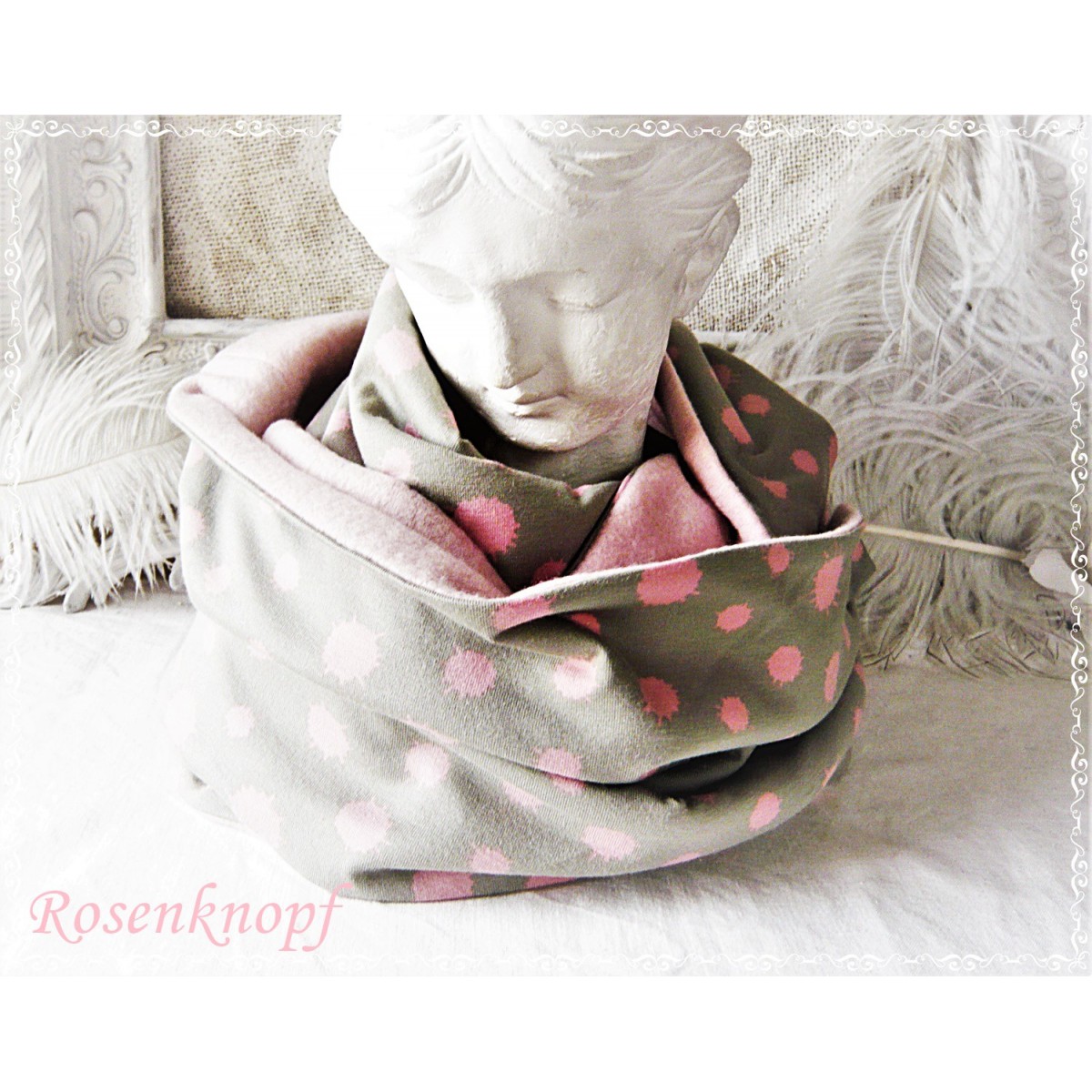 Einzigartiger und zeitloser Loopschal aus Jersey in zartem Grau mit unregelmäßigen Punkten in hellem Rosa.