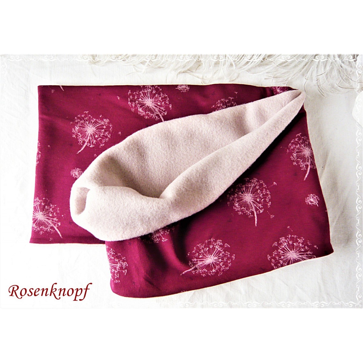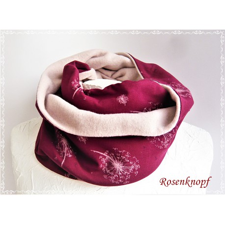 Einzigartiger und zeitloser Loopschal aus Jersey in Bordeaux mit Pusteblumen Schirmchen in hellem Rosa.