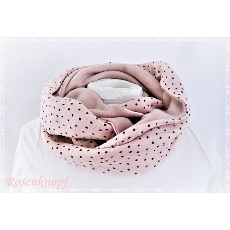 Einzigartiger und zeitloser Loopschal aus hochwertigem Double-Gaze Musselin in Altrosa mit kleinen Punkten in Schwarz.