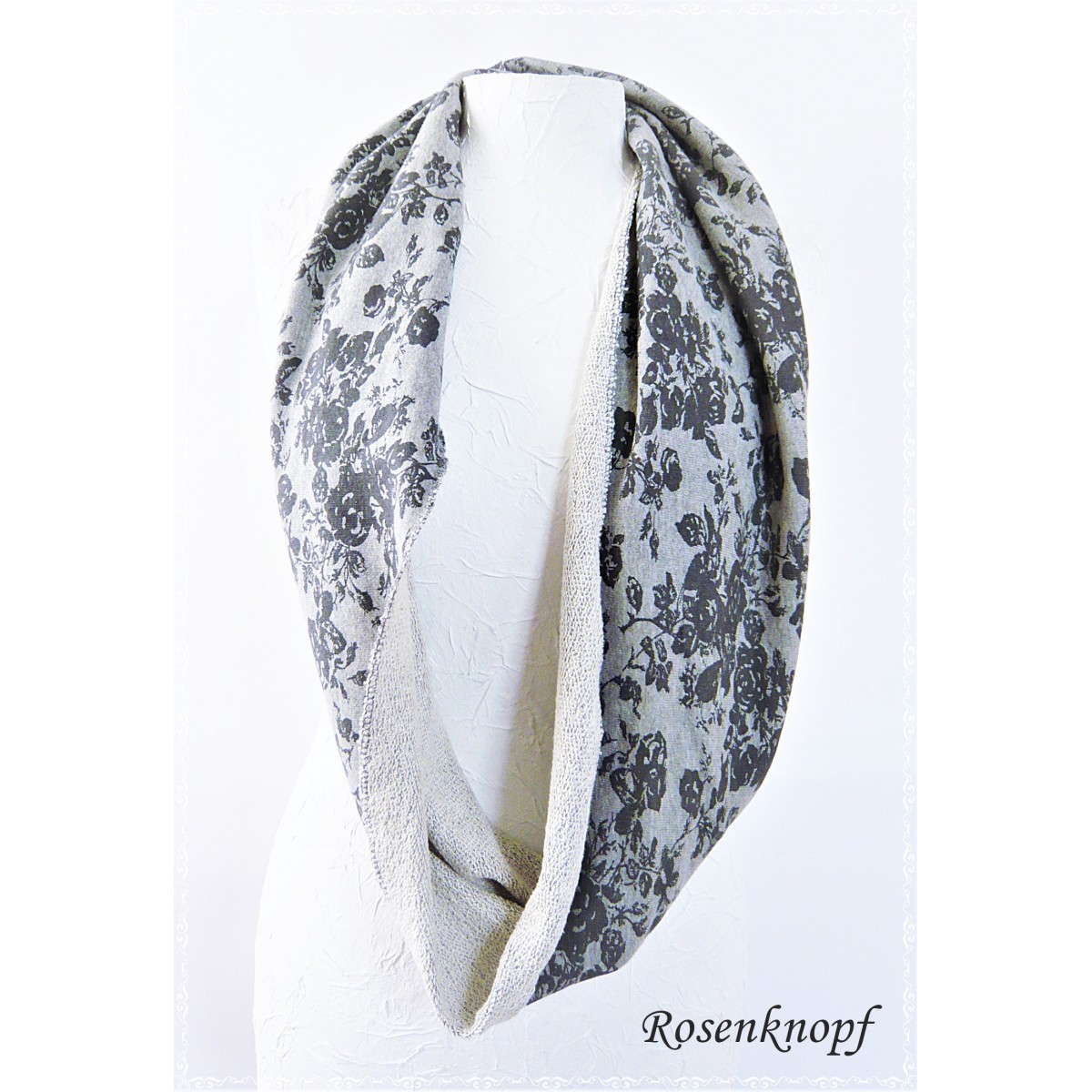 Der Ringschal wurde aus weichem, Sweatshirtstrick mit unifarbener Innenseite gefertigt und ist beidseitig tragbar.