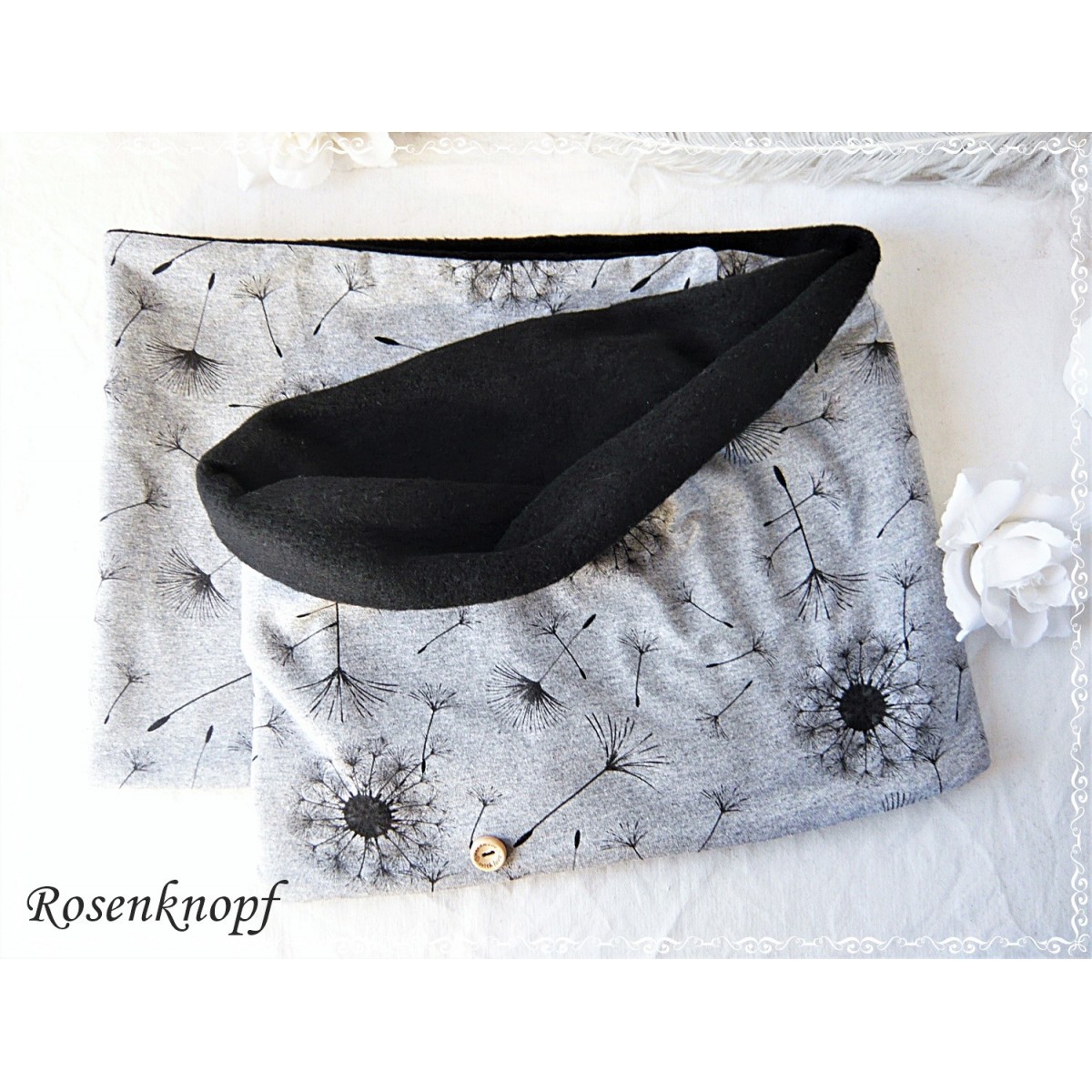 Einzigartiger und alltagstauglicher Loopschal für Frauen aus elastischem und sehr weichem Baumwollstoff in Hellgrau mit aufgedruckten, stilisierten Pusteblumenblüten in Schwarz.