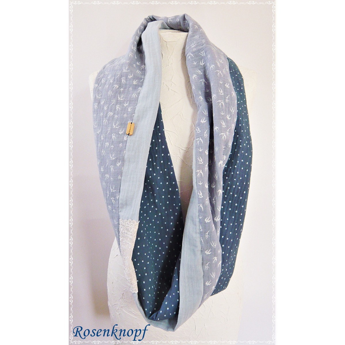 Einzigartiger und zeitloser Loopschal aus Double-Gaze Musselin in zartem Jade, Hellblau und Petrol mit Spitze. Der Schal ist zum Kreis geschlossen und so lang, dass er zweimal um den Hals geschlungen werden kann.