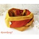Einzigartiger Loopschal der aufwändig aus vier verschiedenen Double-Gaze Musselin Stoffen in Rostbraun, frischem Ockergelb, Ocker und blassem Orange kombiniert wurde.