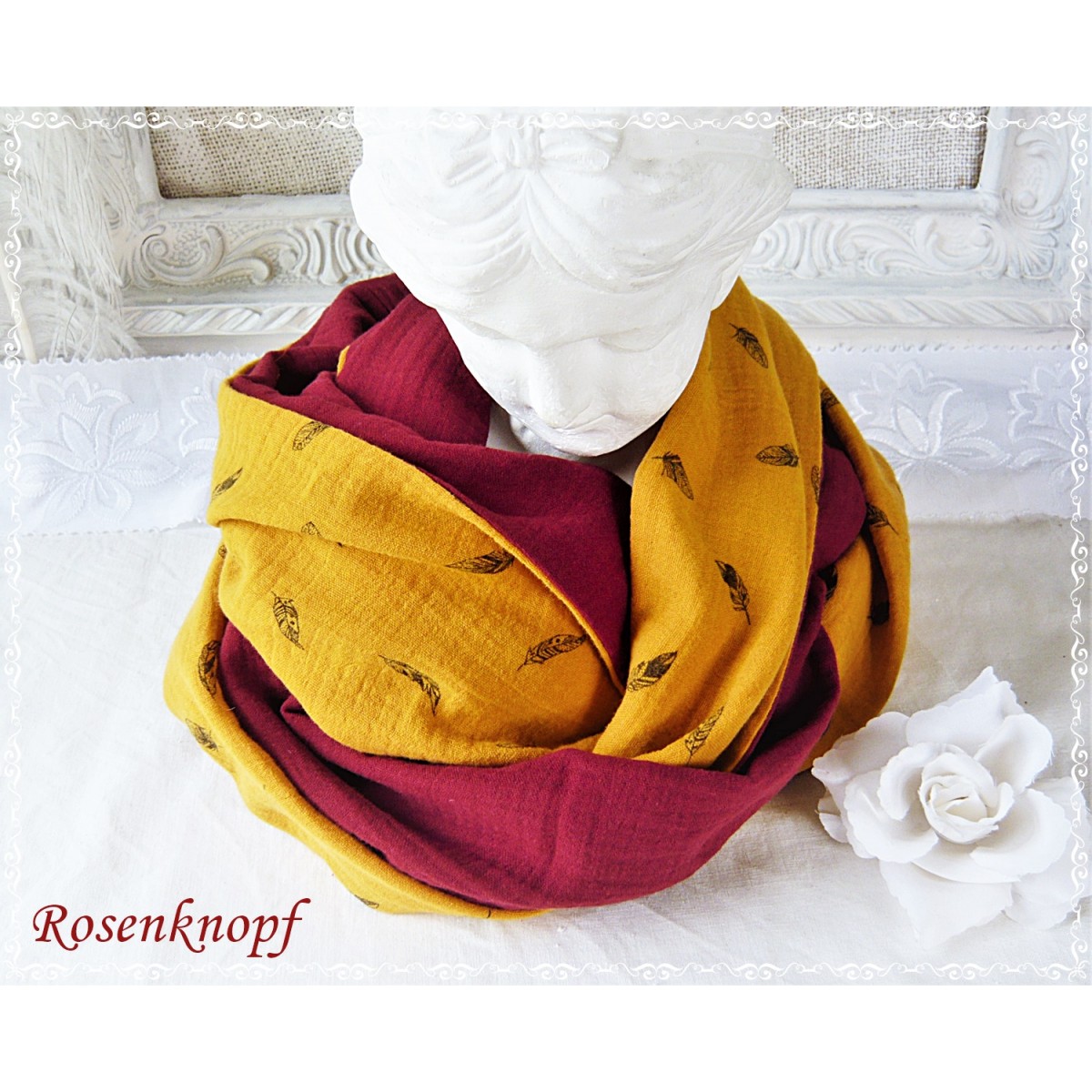 Einzigartiger und zeitloser Loopschal der aus angenehm zu tragendem Double-Gaze Musselin in Ockergelb mit aufgedruckten kleinen Federn in Schwarz gefertigt wurde.