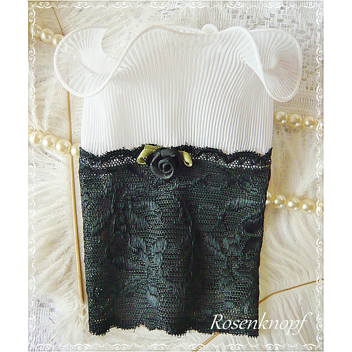 Elegant verspielte Pulswärmer/Spitzenstulpen aus elastischer Spitze in Schwarz und angesetzter Vintage Plisséerüsche in Weiß.