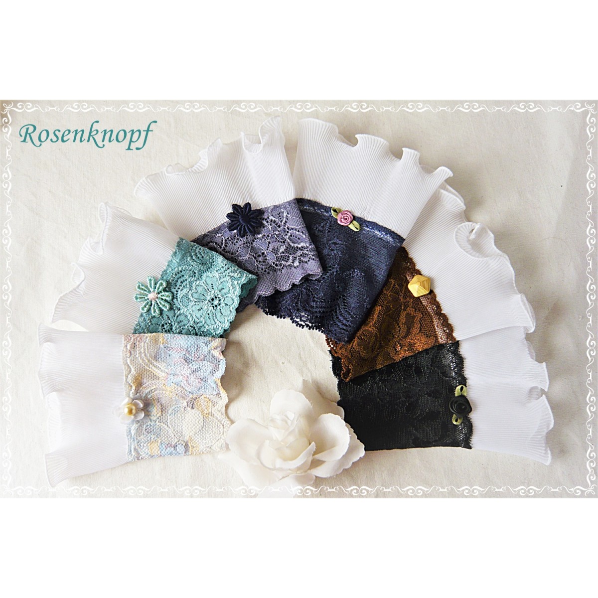 Die elastischen Spitzenstulpen ziert eine Plisséerüsche und eine Blüten Applikation.