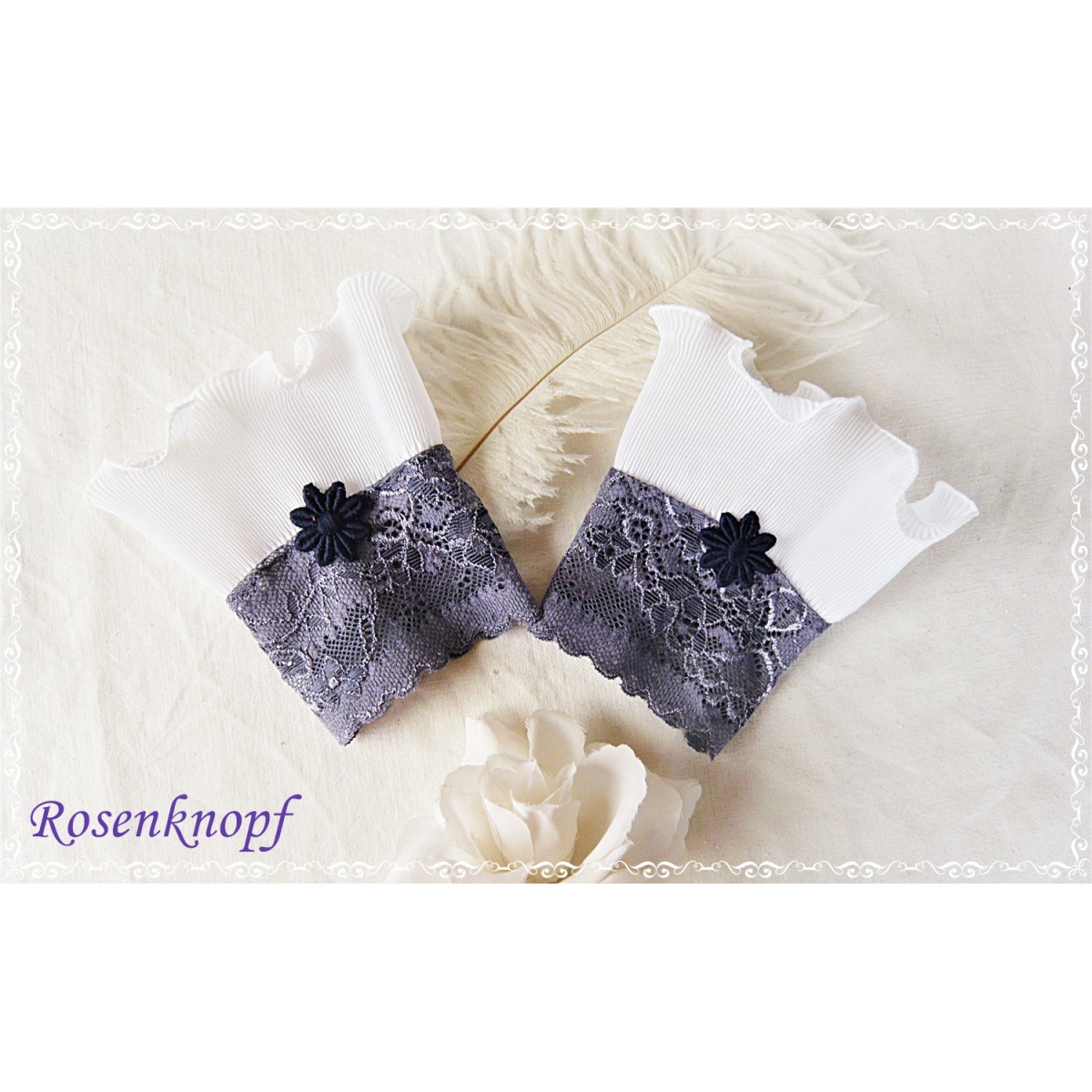 Elegant verspielte Pulswärmer/Spitzenstulpen aus elastischer Spitze in Lavendel mit angesetzter Vintage Plisséerüsche in Weiß.