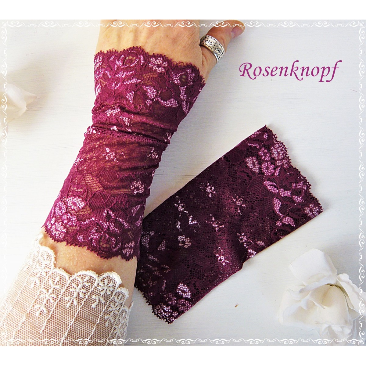 Die elastischen Spitzenstulpen zieren rosafarbene Einschüsse und Bögen auf beiden Seiten.
