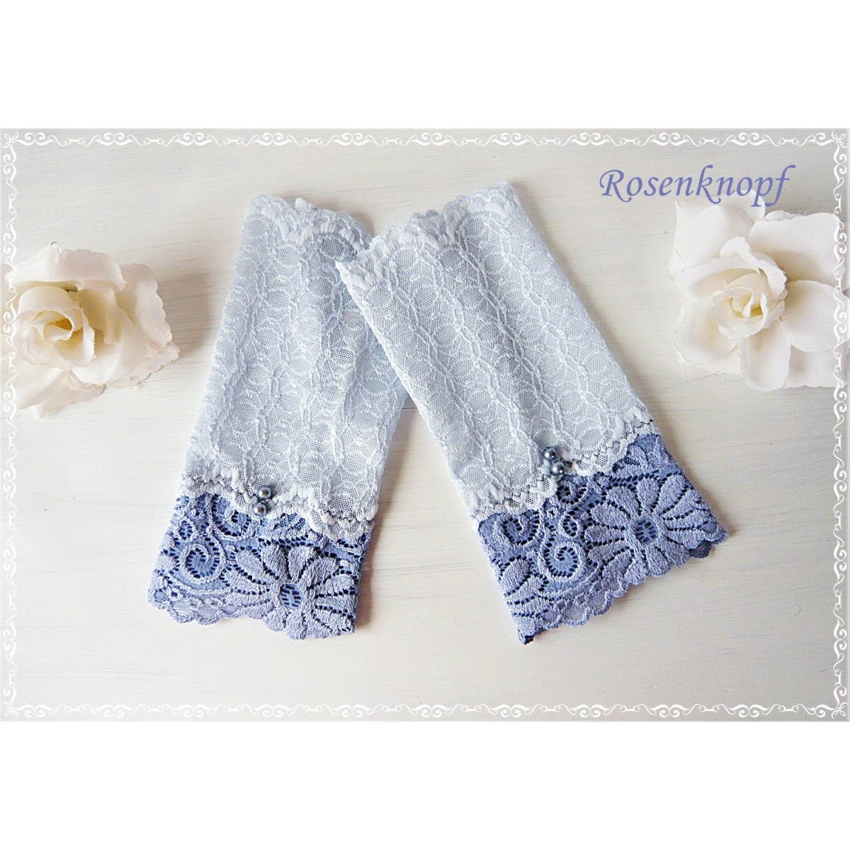 lll➤ Armstulpen/Pulswärmer aus Spitze in Hellblau und Lavendel zu einer Hochzeit, Standesamt, Fest.