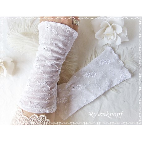 Elegante Spitzenstulpen aus elastischem Tüll mit floraler Stickerei in Reinweiß.