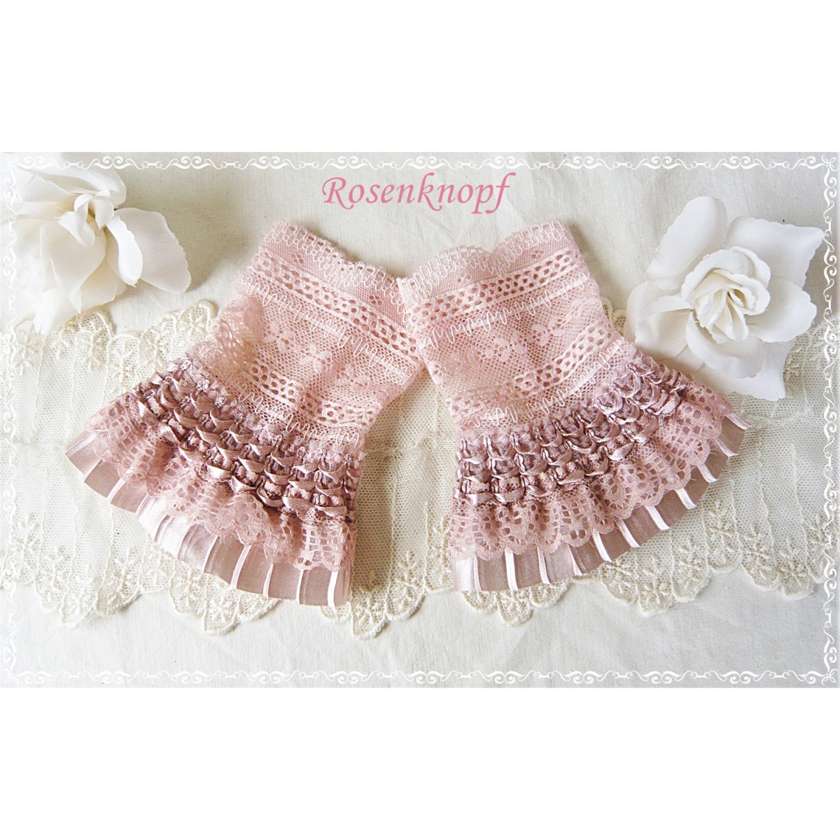 Romantische Spitzenstulpen, bzw. Kurz-Manschetten aus elastischer Spitze mit floralem Muster in zartem Altrosa mit einen Hauch von nostalgischem Charme, die am Arm verspielt feminin wirken.