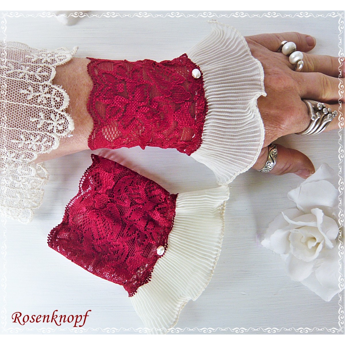 Elegant verspielte Pulswärmer/Spitzenstulpen aus elastischer Spitze in Weinrot mit angesetzter Vintage Plisséerüsche in Ivory.