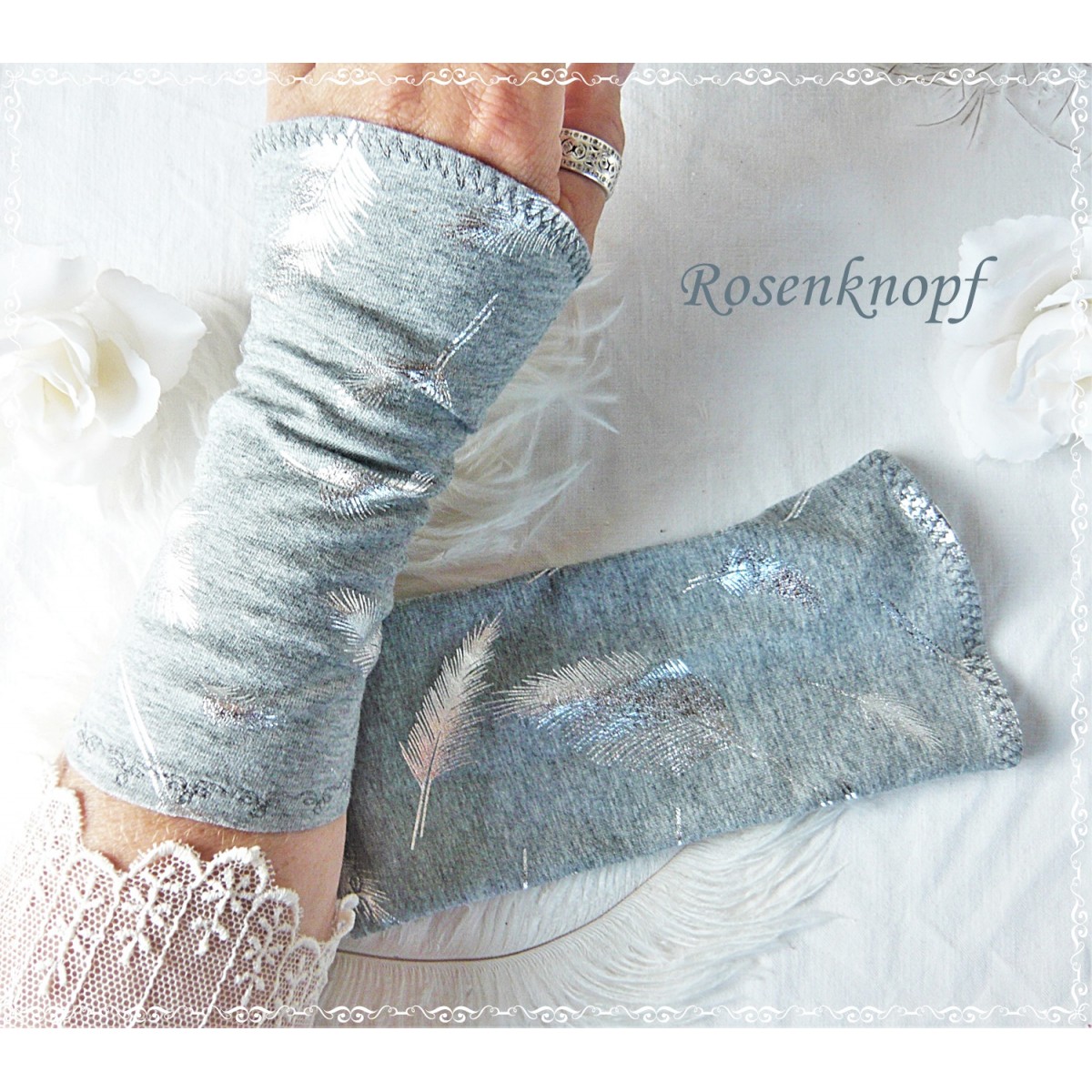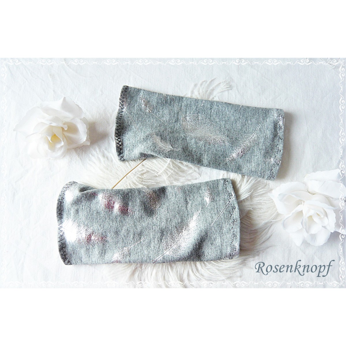 lll➤ Armstulpen/Pulswärmer aus Jersey in Grau mit silberfarenen Federn.
