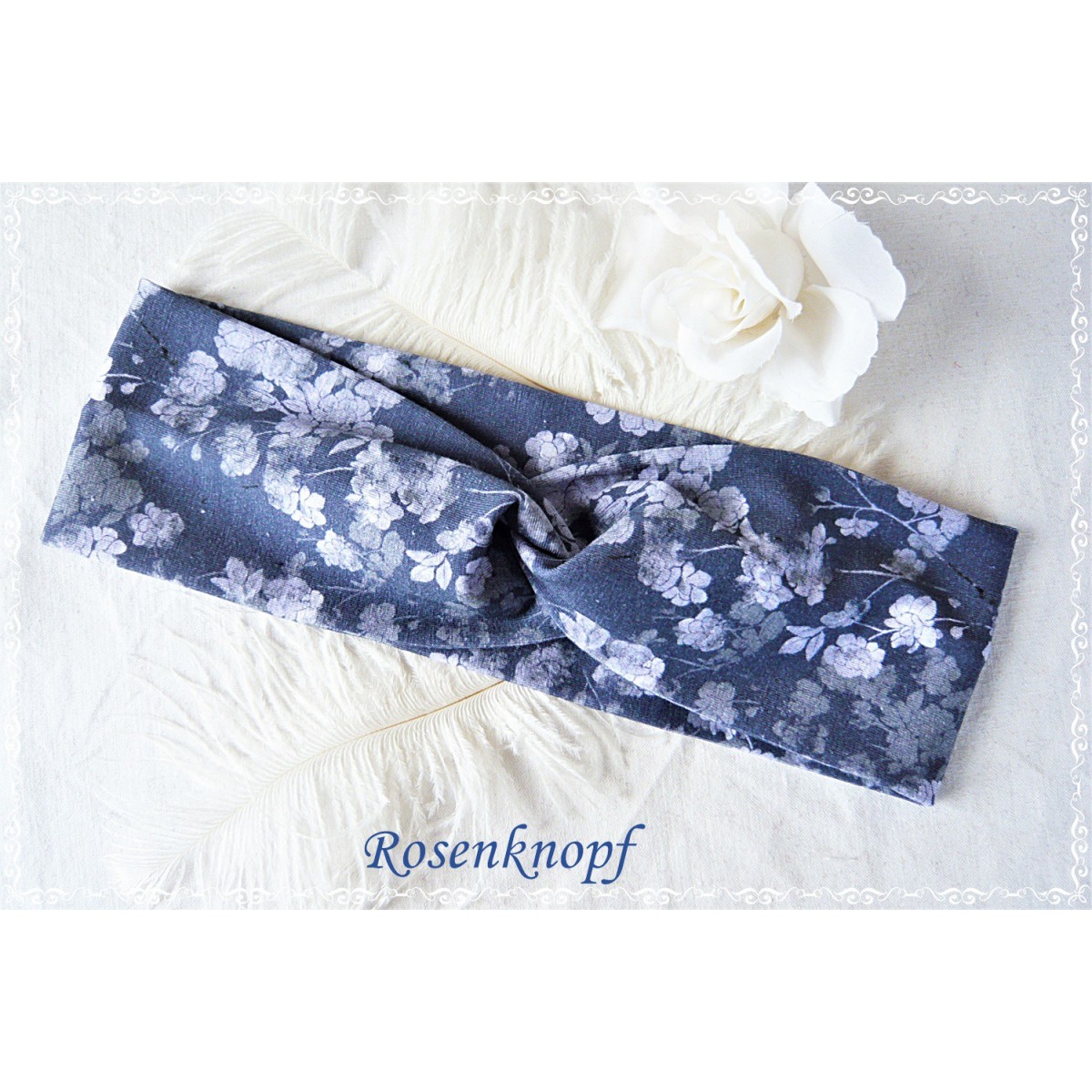 Zeitloses Stirnband aus elastischem Jersey mit feinem Blumenmuster in Blautönen und Hellgrau.