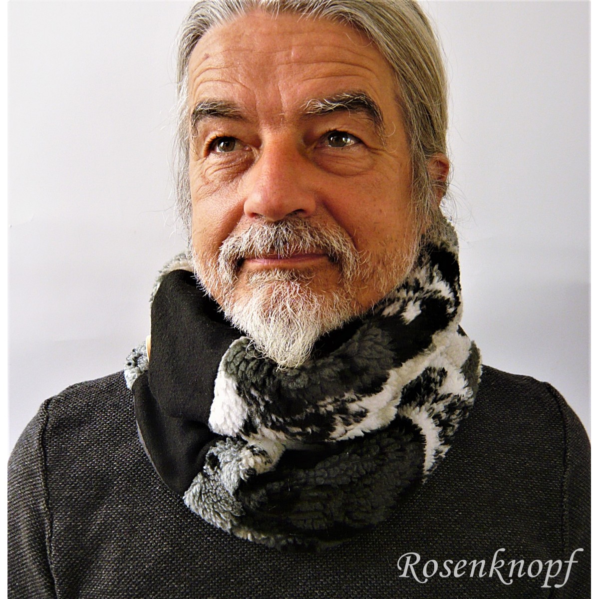 lll➤ Schlupfschal/Herrenloop aus gemustertem Upcycling Webpelz in Hell- und Dunkelgrau, Beige, Weiß und Schwarz.