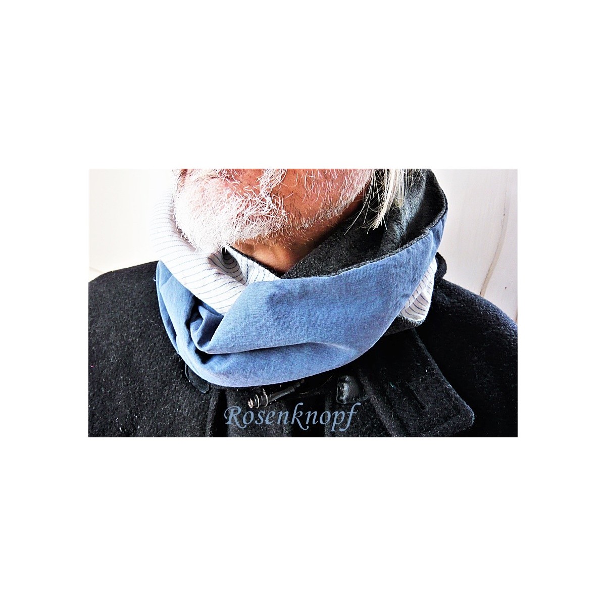"MALIN" ist ein einzigartiger Loop für Herren aus Wollmischgewebe in Dunkelblau und Grau mit feinen Streifen.