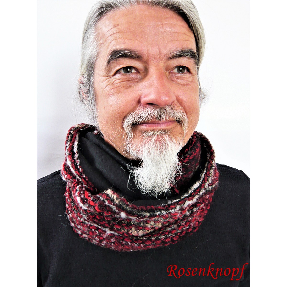 Loopschal/Schlauchschal für Herren aus kuschelweichem Strickstoff mit Streifenmuster in den Farben Rot, Weinrot, Schwarz und Ivory.