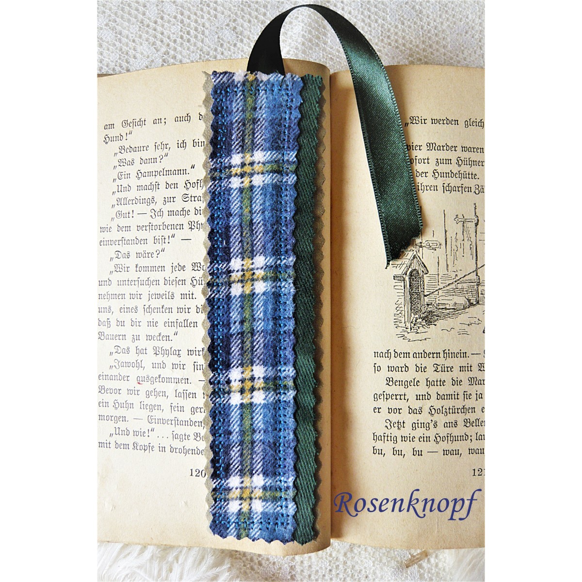 Im Shabby Stil leicht ausgefranst und mit aufgenähten, gezackten Stoffstreifen aus blauem Karomuster und dunkelgrünen Stoff verziert, wird Bücherlesen mit diesem Stoffzeichen zum reinsten Vergnügen!
