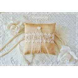 ♥"SCARLETT"ist ein elegant und romantisch gearbeitetes Ringkissen in zart schimmerndem Ivory♥ Für dieses Kissen wurde weißes Leinen auf der Vorderseite mit erhabener Tüllspitze in Ivory in Form von Rosenblüten belegt, die Rückseite wurde aus Naturseide gefertigt. Damit Sie Ihre Trauringe befestigen können, habe ich schmale, weiße Satinbänder unter drei...