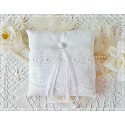 ♥"Scalett" ist ein elegant und romantisch gearbeitetes Ringkissen in Weiß♥ Für dieses Kissen wurde Leinen auf der Vorderseite mit erhabener Tüllspitze in Form von Rosenblüten in Weiß belegt, die Rückseite wurde aus Satin gefertigt. Für die Ringe habe ich Satinbänder unter drei Perlen angebracht.