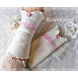 Für den Oberstoff habe ich weißen Stoff mit zartem Blumen-Muster verwendet, der Unterstoff ist Weiß.