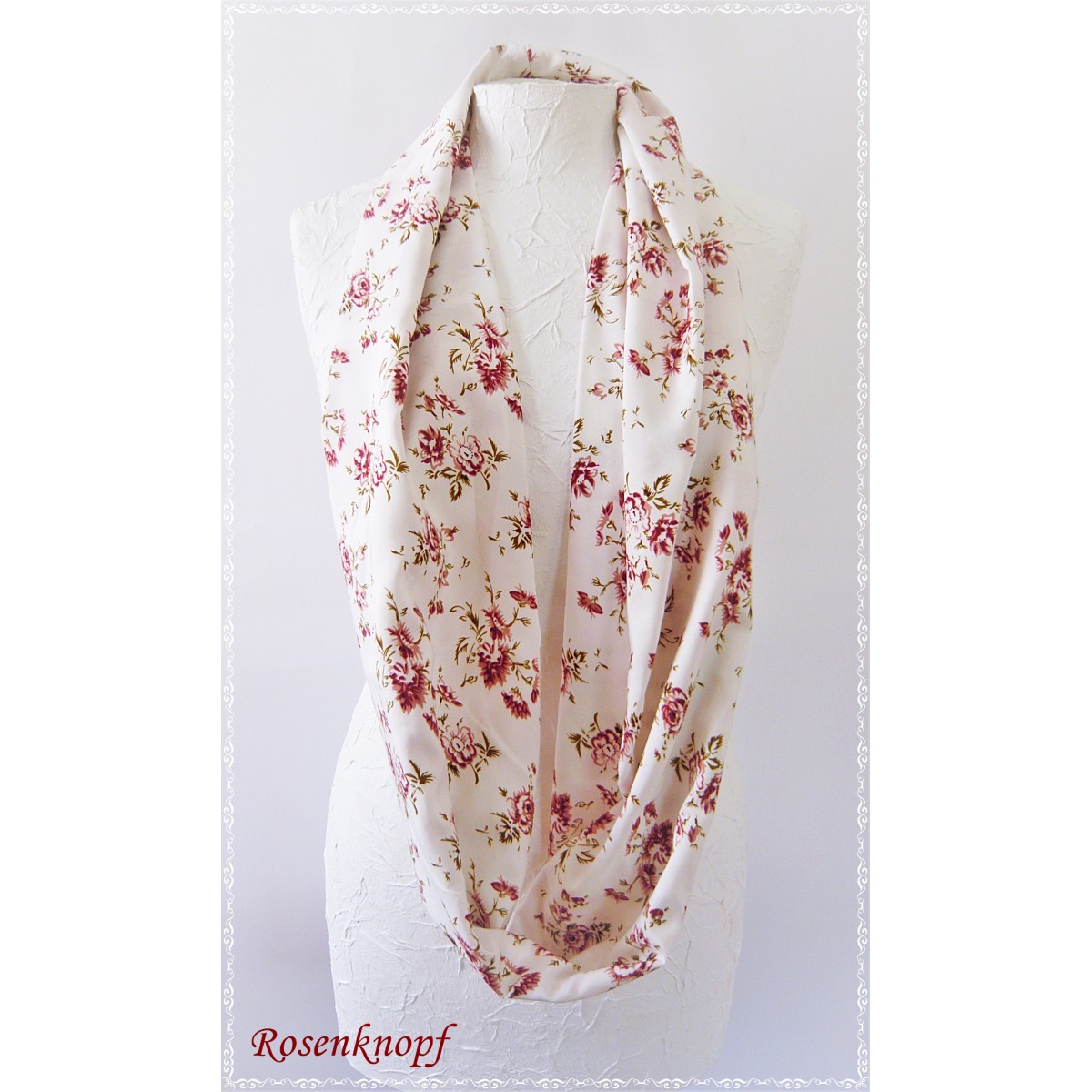 lll➤ Damenschal/Loop in Ivory mit Rosenblüten in gedecktem Rot und Altrosa zu einer Hochzeit, Standesamt, Fest.